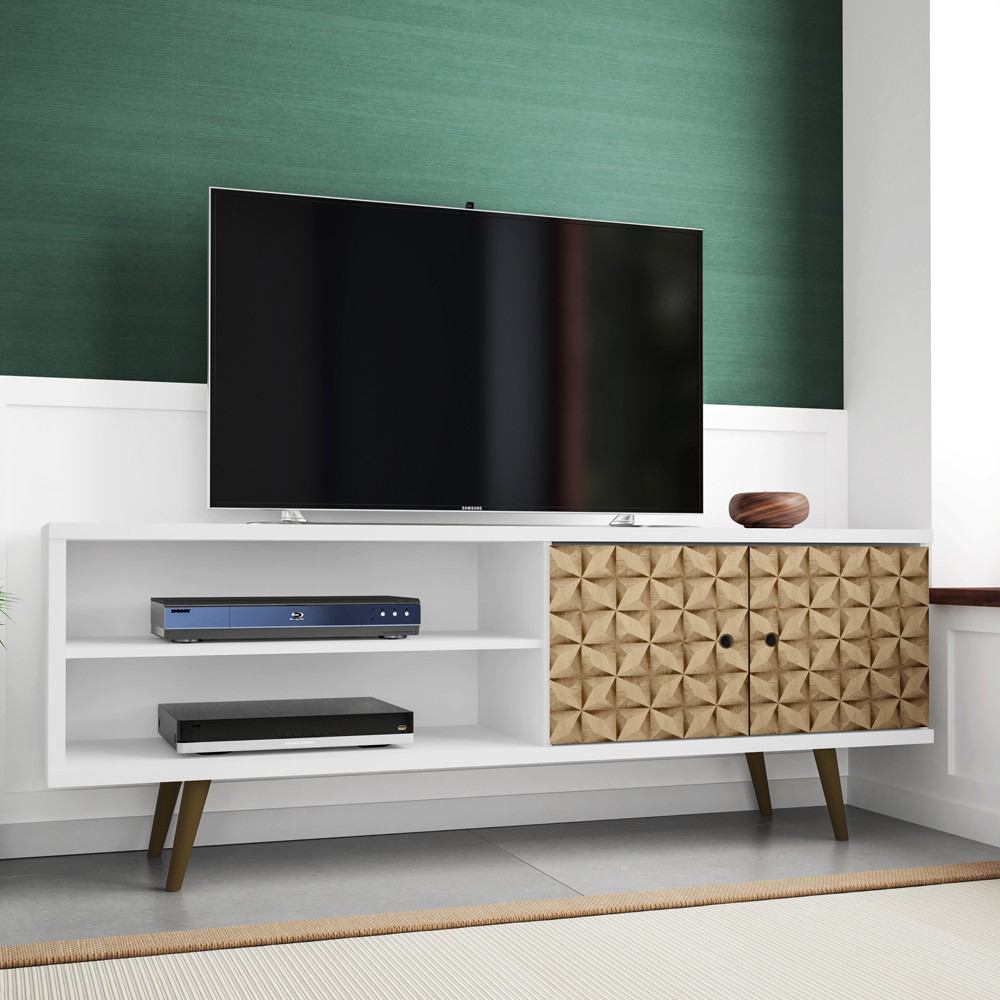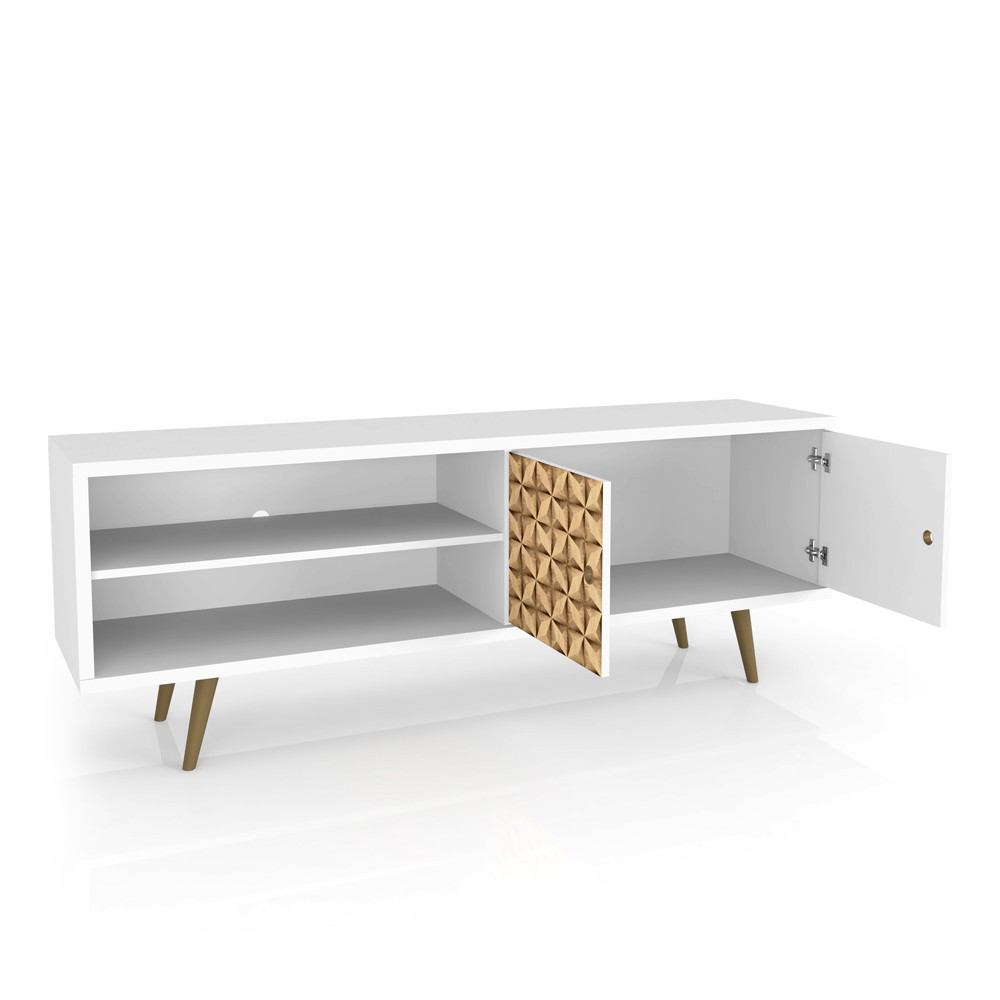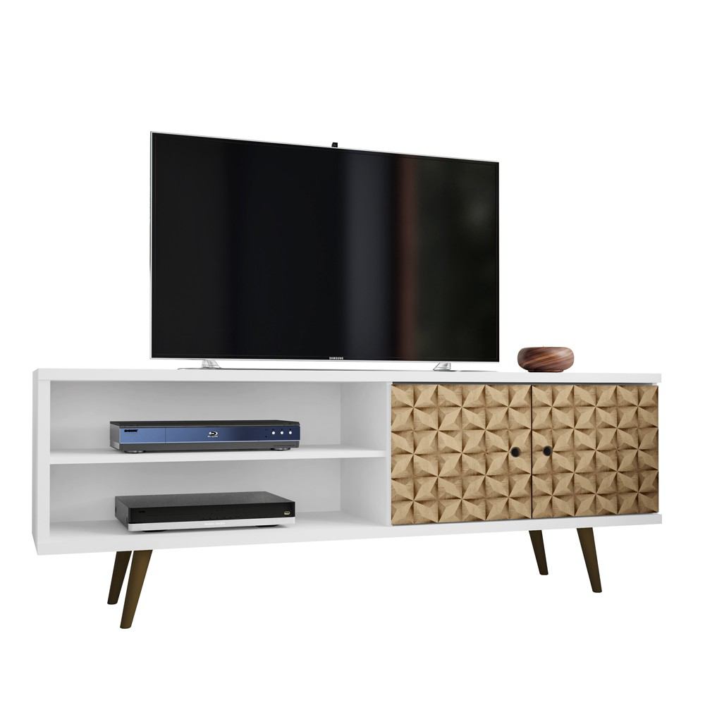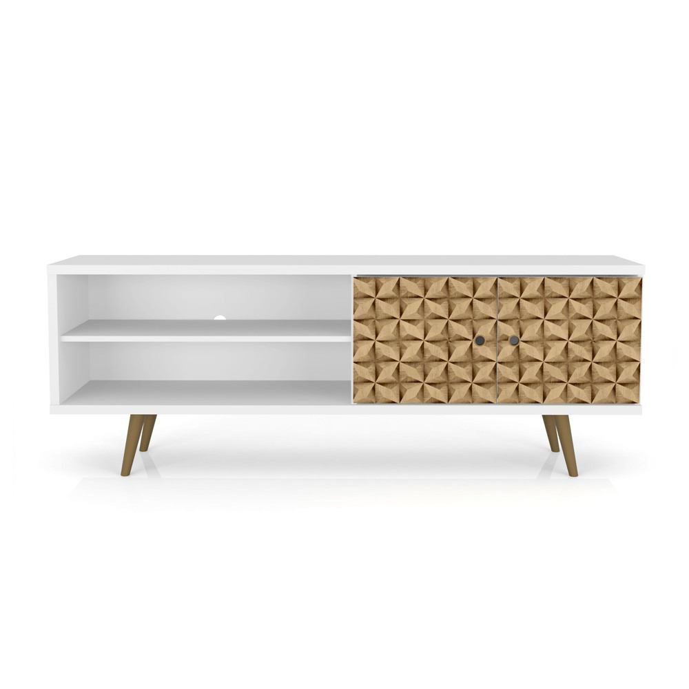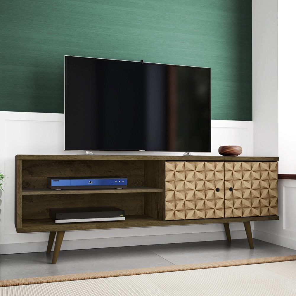 The Liberty 62.99 Mid-Century Modern TV Stand is a high quality, beautifully crafted, functional unit. Featuring two open shelves, and one large concealed compartment perfect for stashing DVDs, board games, electronics, and media accessories, this entertainment center is the ultimate gathering place and will create a statement in any space. Artful grooves mix well with any decor and splayed wooden legs add character and ease for moving.