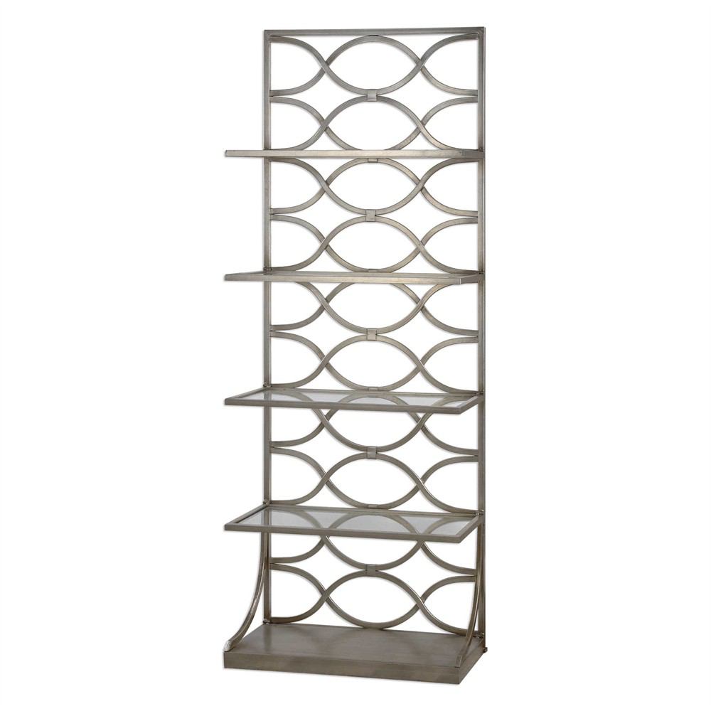 Hand forged iron in lightly antiqued silver leaf featuring four tempered glass shelves. The back is unfinished and offers wall anchors.