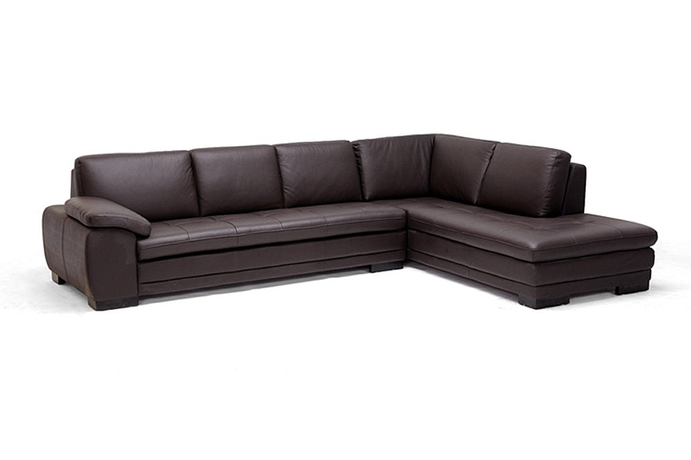 One of our most popular sectionals, this two-piece sofa/chaise set will receive countless compliments as a result of its modern, clean design and excellent workmanship. You are assured long-lasting comfort with the inclusion of the sturdy hardwood frame, high-density foam cushioning, and internal rubber lattice supports. The seating area has a mid to high level of firmness, and the sofa and chaise can be connected with the single wide bracket between the two pieces to prevent separation. Note that the feet are wooden with a medium stain finish and the cushions are all attached, non-removable.