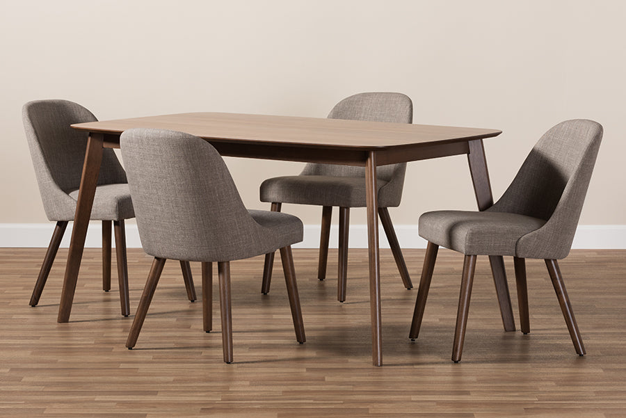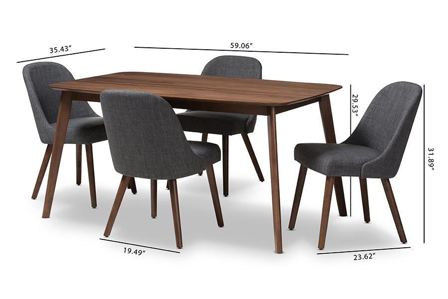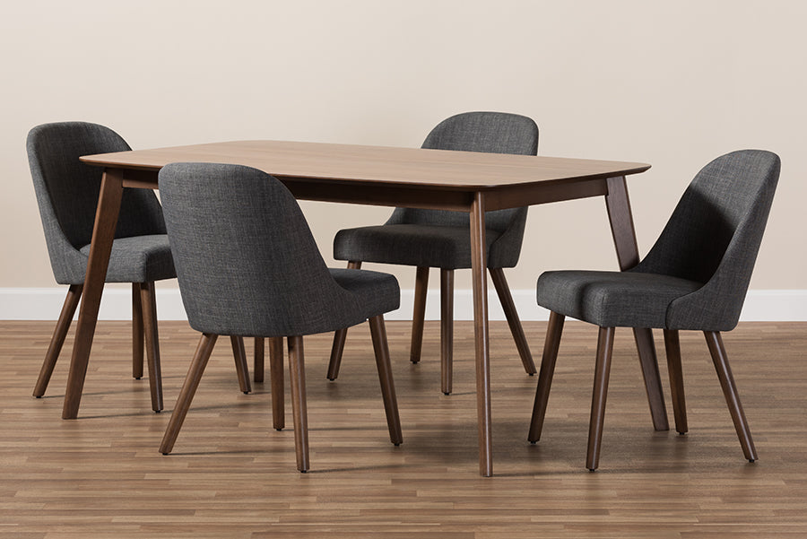The gentle curves and minimalist style of the Cody five-piece dining set make it easy to coordinate in casual and formal settings. The set's mid-century modern-inspired design is apparent in the curved, slightly arched chairbacks. The Cody is built to last with solid rubberwood construction. The chair features chic, dark grey fabric upholstery and a comfortable, foam-padded seat.