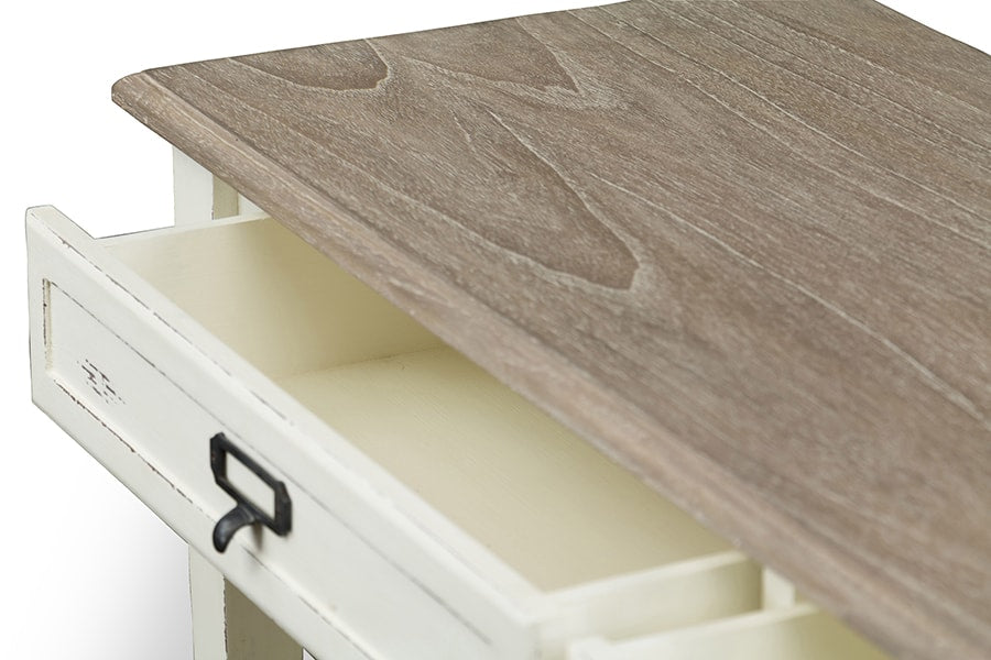 Boasting a white-streaked and distressed finish plus plenty of storage space via two drawers and two shelves, our Dauphine Traditional French Accent Console Table unifies fashion and functionality. The genuine mindi-wood top features a white-streaked natural veneer that pairs perfectly with the distressed white finishing that comprises the remainder of this console table. Black metal drawer handles offer attractive contrast. Superb value in a discount-furniture item.
