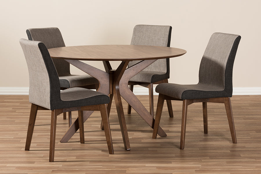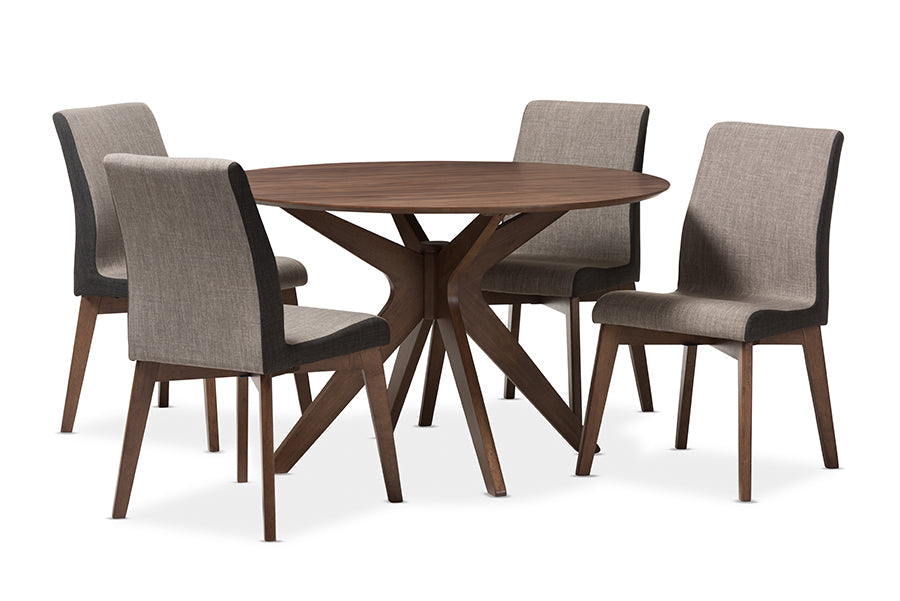 Channel retro styling in your contemporary space with the stunning Kimberly mid-century modern round 5-piece dining det. Set includes one four-seater table and four matching dining side chairs for a complete setting. Table features round shape with mid-century curves for retro vibes. Dining chairs are constructed of rubberwood and are upholstered in two-tone brown and light brown polyester fabric, providing a soft-to-touch surface.