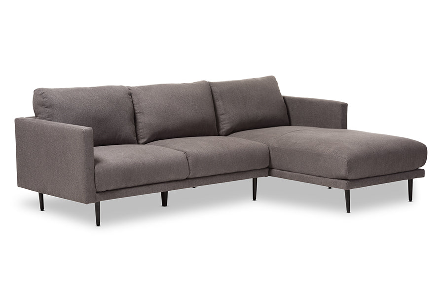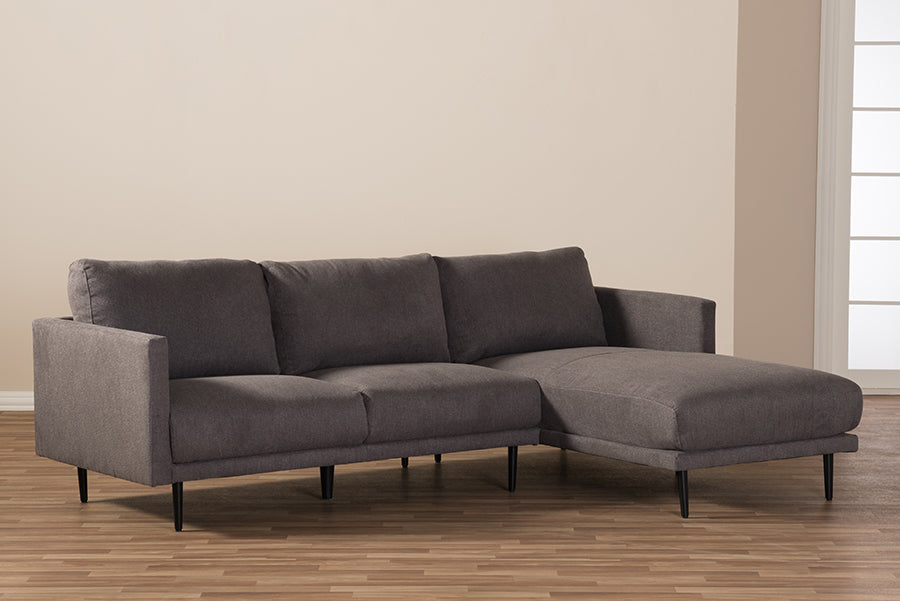 Metal legs support the sectional sturdily. Available in grey fabric, the Riley features neutral tone that will match with your home decor. The perfect blend of good looks and practical seating, the Riley 2-piece sectional sofa is built for comfort at home. Perfect for those who want to lean back, put up their feet and get comfortable. Made in China, the Riley requires assembly.
