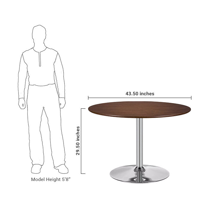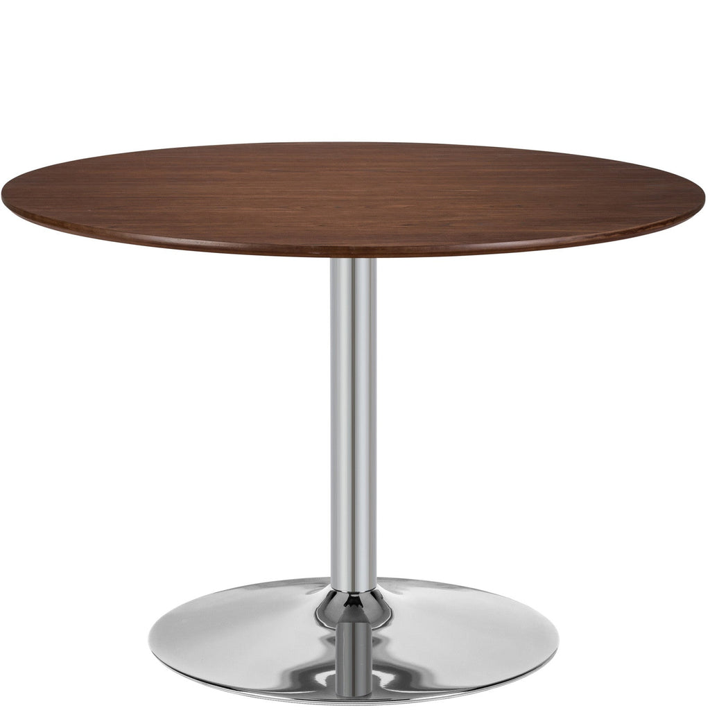 Perfect for an upscale eat-in kitchen or petite dining space, the Michaela Dining Table is designed to delight. Offering a chic silhouette, this pedestal table is ideal for a quiet breakfast or intimate dinner. The table features a chrome plated steel pedestal base with a round foot and sleek, slim post. The tabletop is crafted from beautiful walnut wood veneer with a rich, deep finish. Delivering wonderful contrast, this table is beautiful on its own or accentuated with a stunning vase or centerpiece.