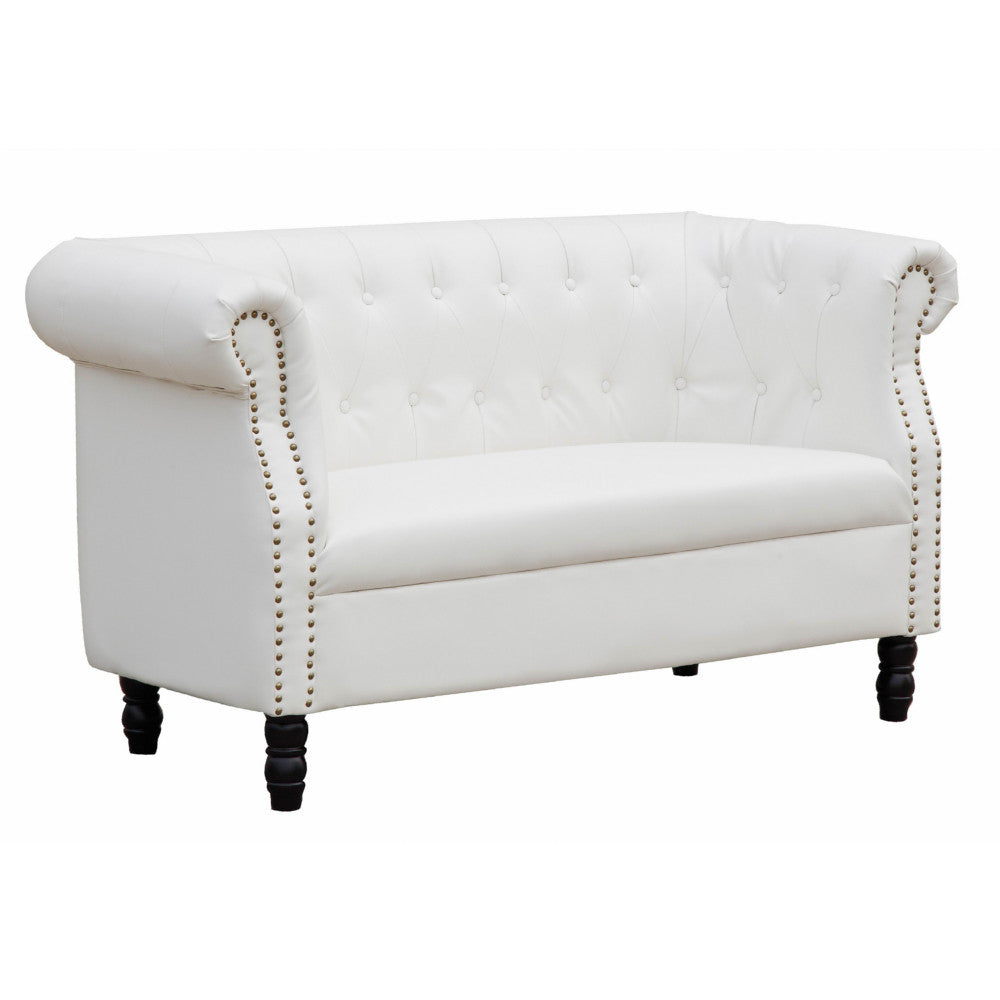 The bonded leather Chester Loveseat will add style and comfort to any living room space. Chester Loveseat has a tufted back and arm, and is decorated with gold nail heads on the front.