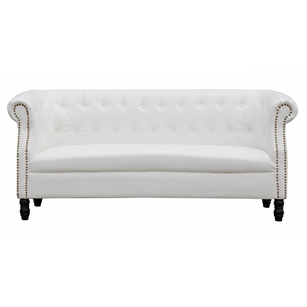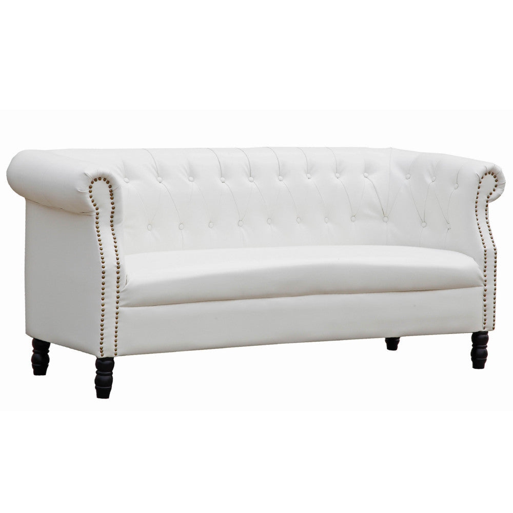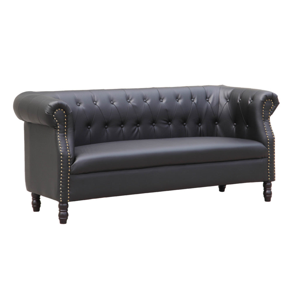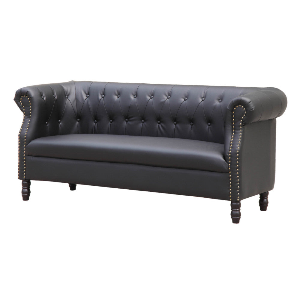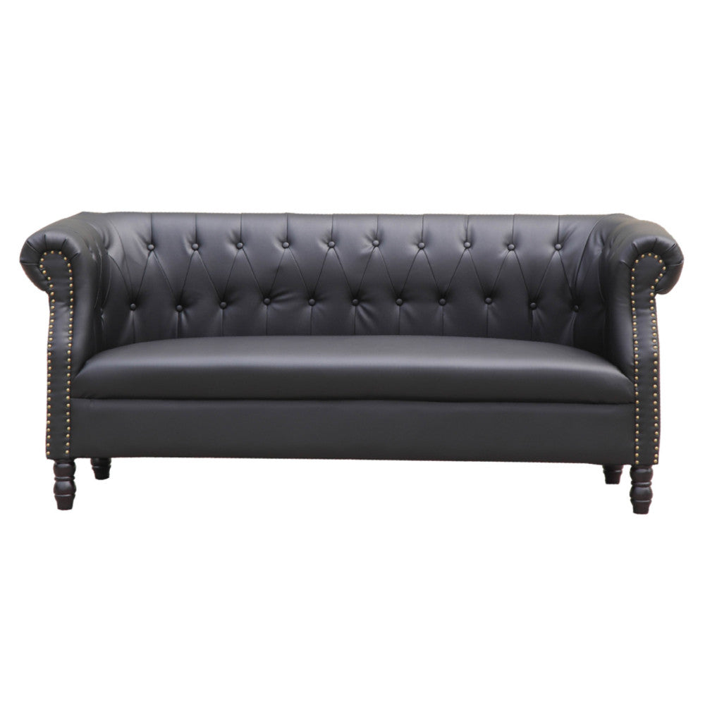 The bonded leather Chester Sofa will add style and comfort to any living room space. Chester Sofa has a tufted back and arm, and is decorated with gold nail heads on the front.