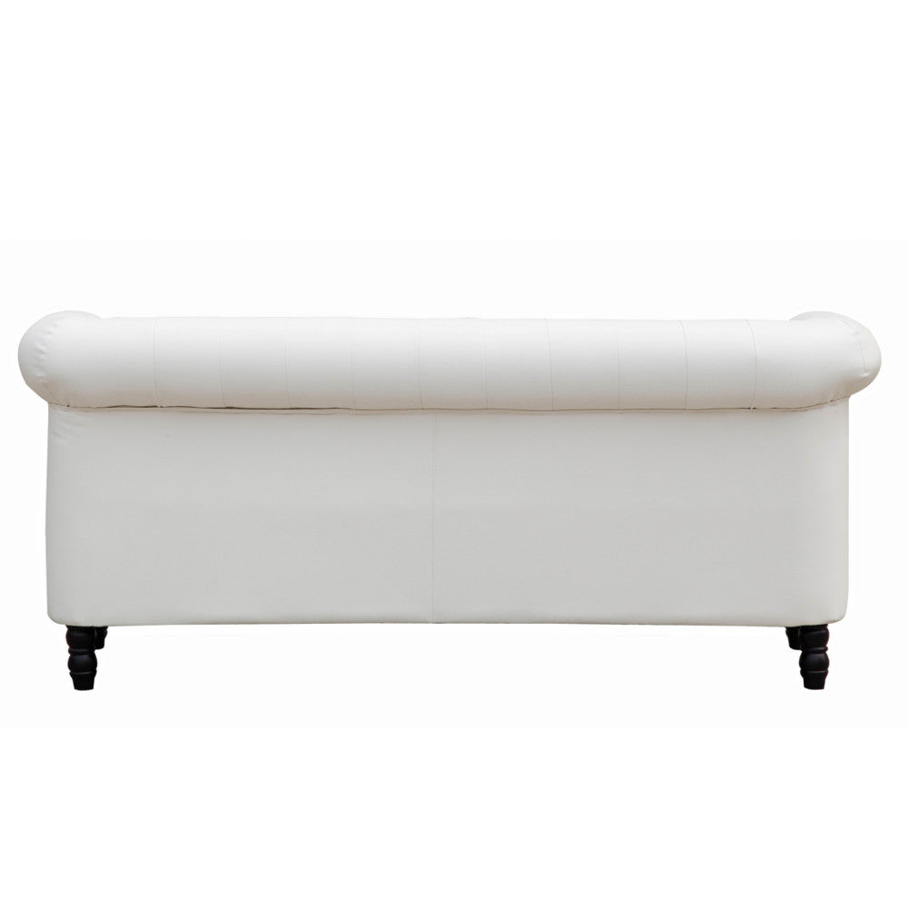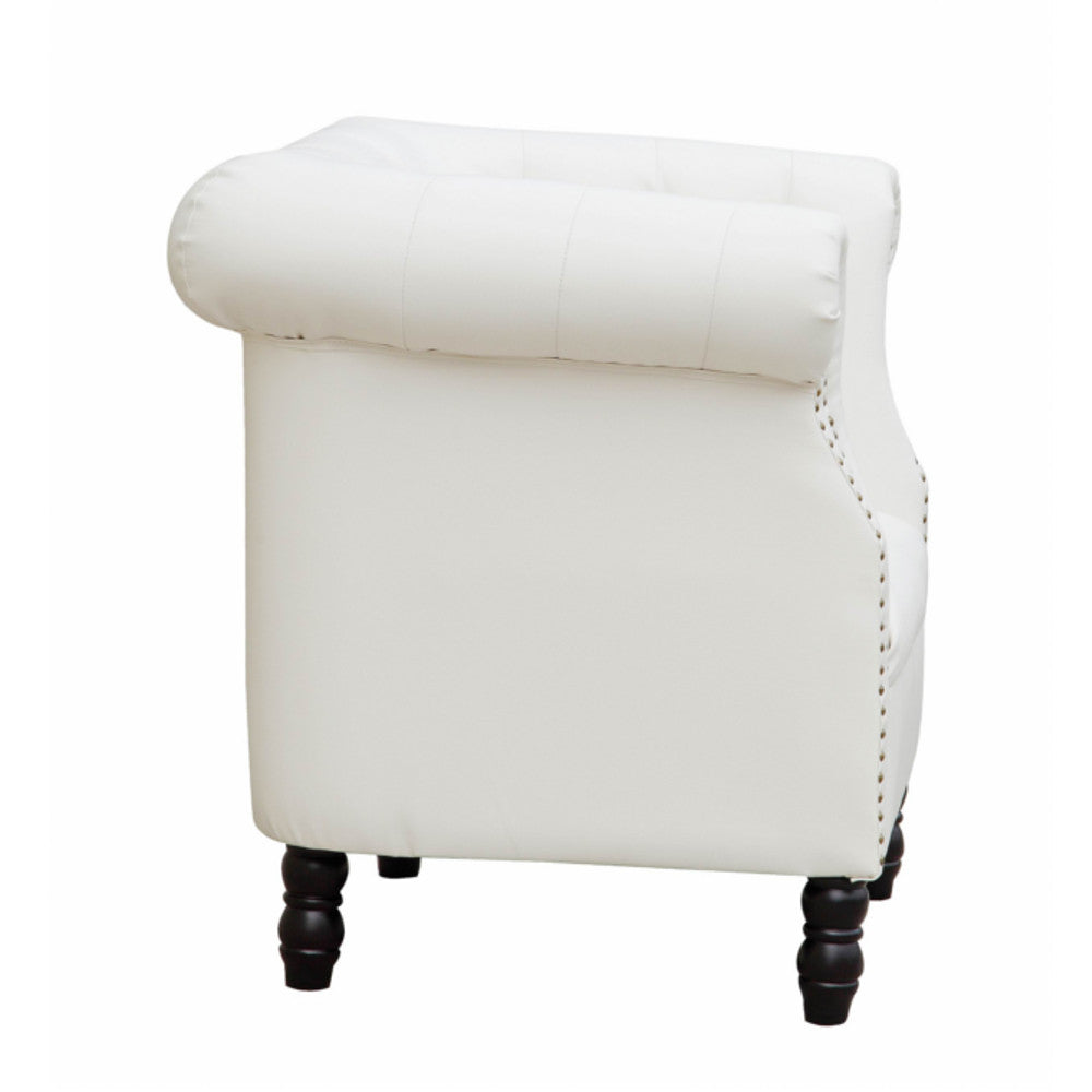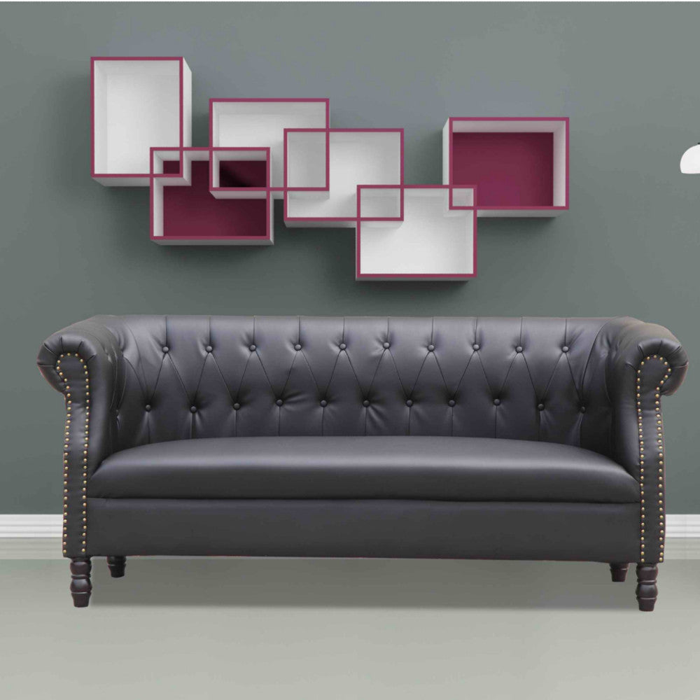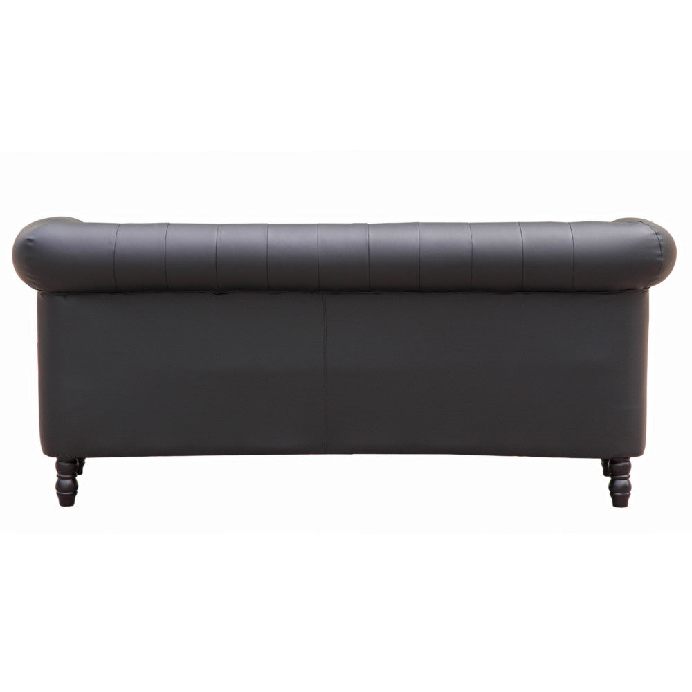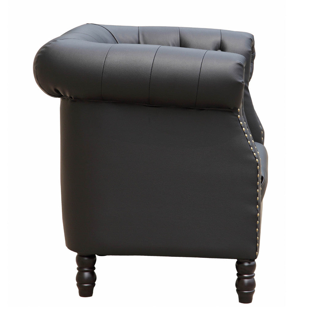 The bonded leather Chester Sofa will add style and comfort to any living room space. Chester Sofa has a tufted back and arm, and is decorated with gold nail heads on the front.
