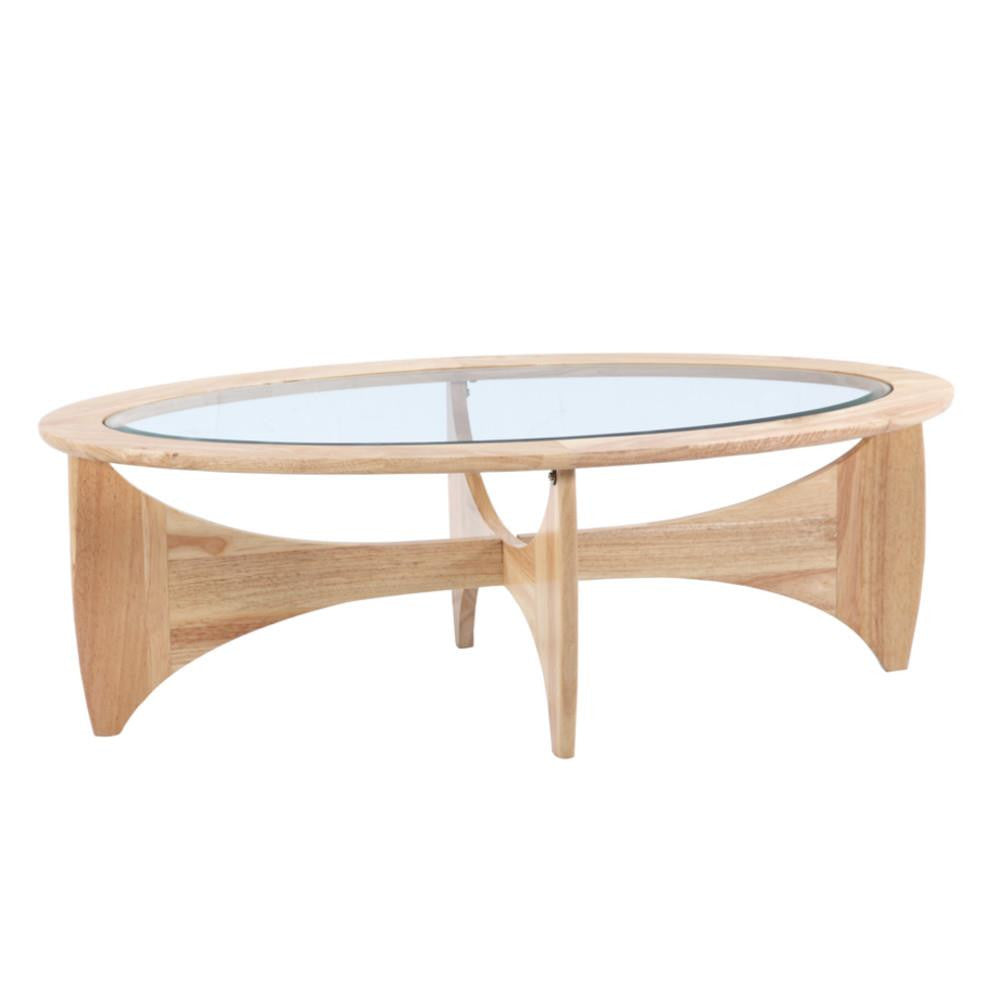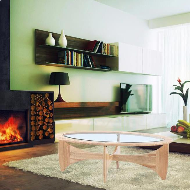 A solid rubberwood coffee table with a 5mm beveled glass inlaid. The Opec coffee table is a stunning oval shaped table set on an interlocking cross of wood. The 5mm thick glass is set in a wooden frame. This beautiful wood and glass coffee table will be an attractive addition to your home living space.