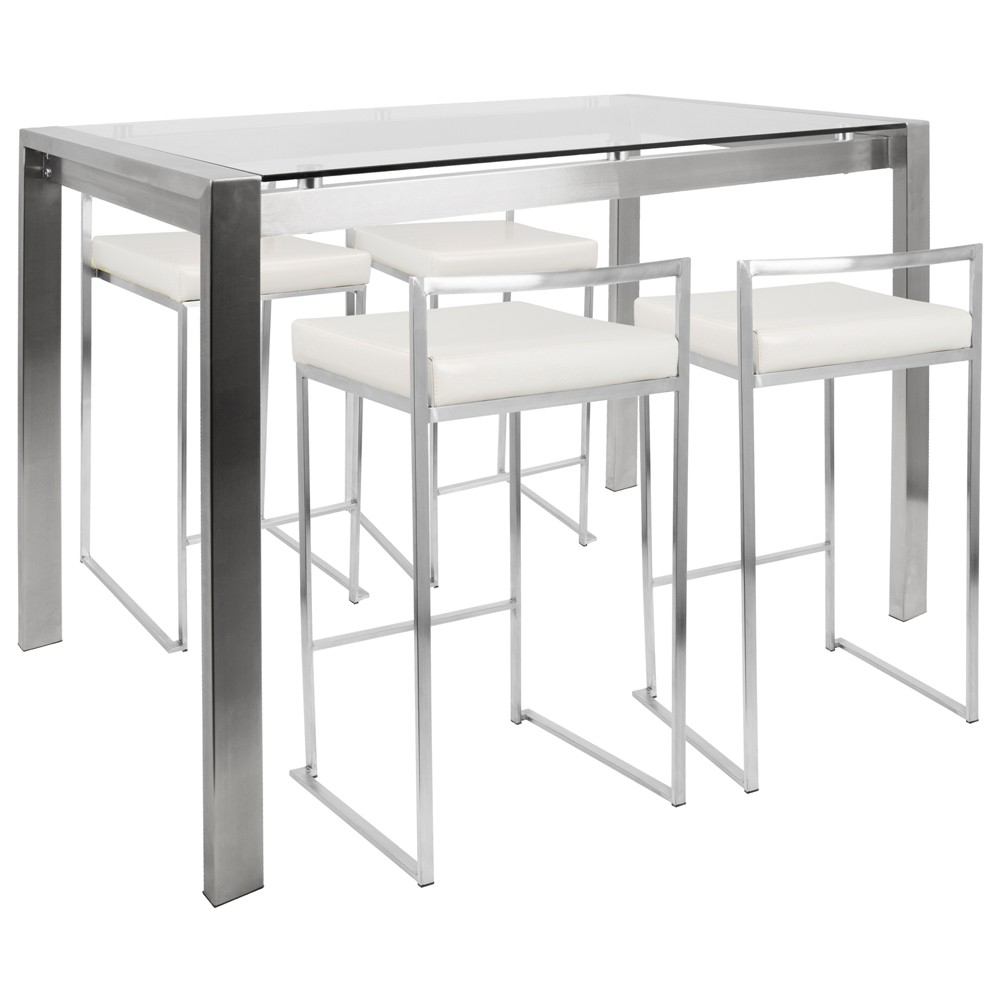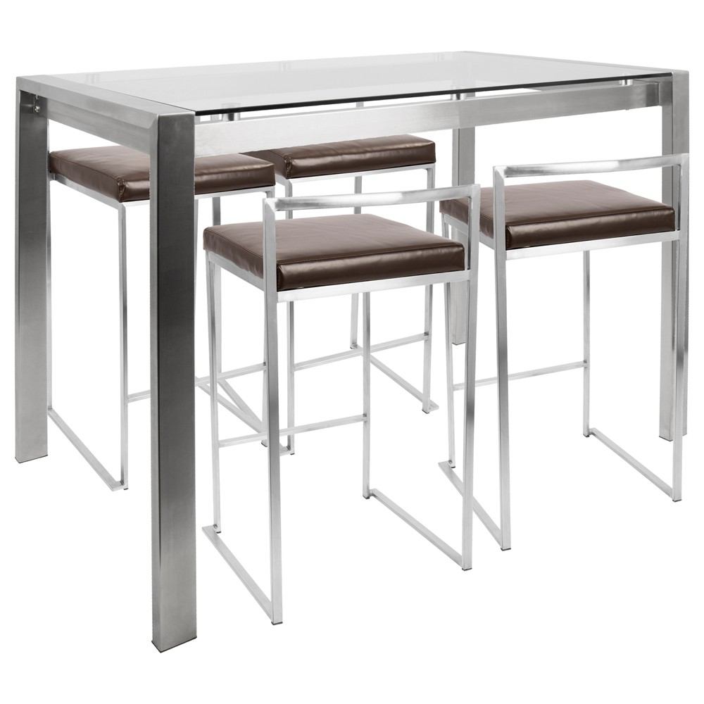 Elegant and substantial, the Fuji Counter Table Set from LumiSource is the peak of streamlined sophistication. This set features brushed stainless steel frames, a tempered glass Table top, and fixed height Stool with PU leather seats. Includes 1 Table and 4 Stool.