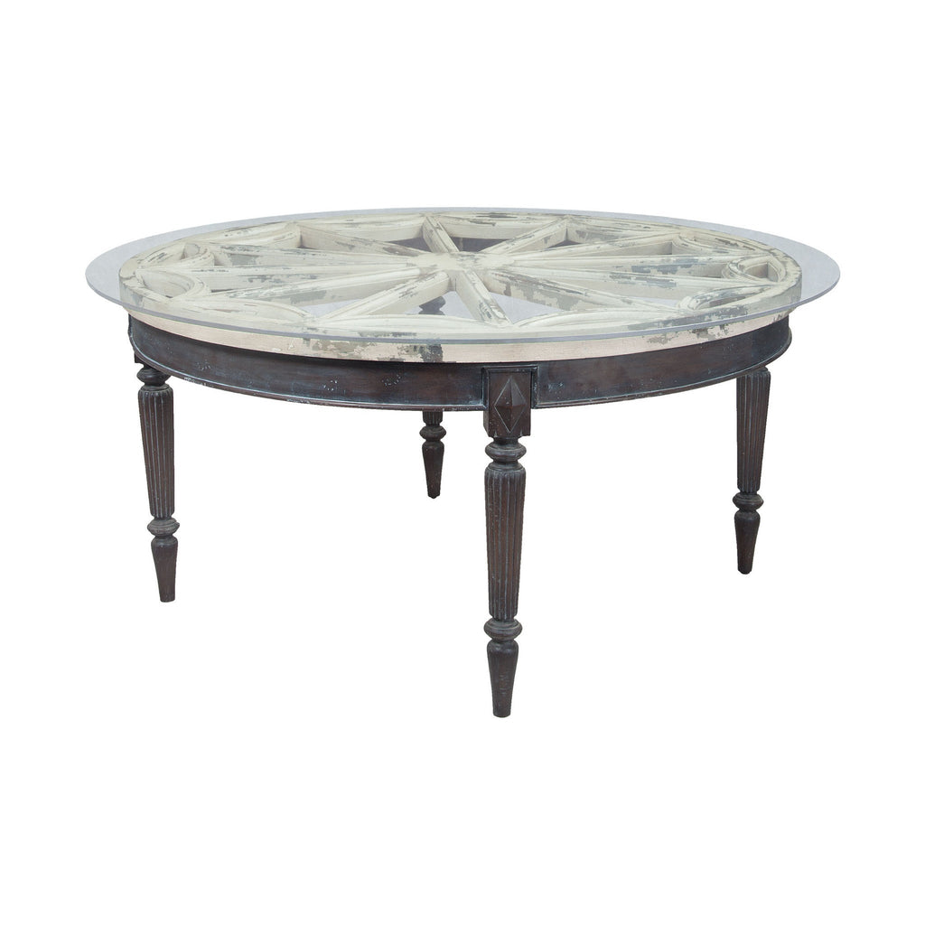 Heritage Grey Stain on table base with Vintage Bouleau Blanc finish on carved element table top under glass.