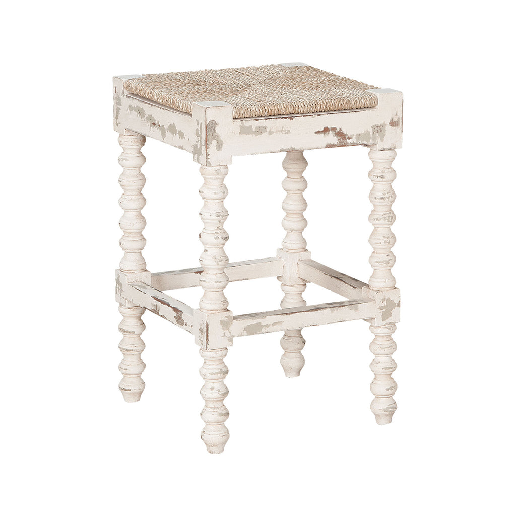 Crossroads European White finish on carved spindle counter stool. Natural rush seat.