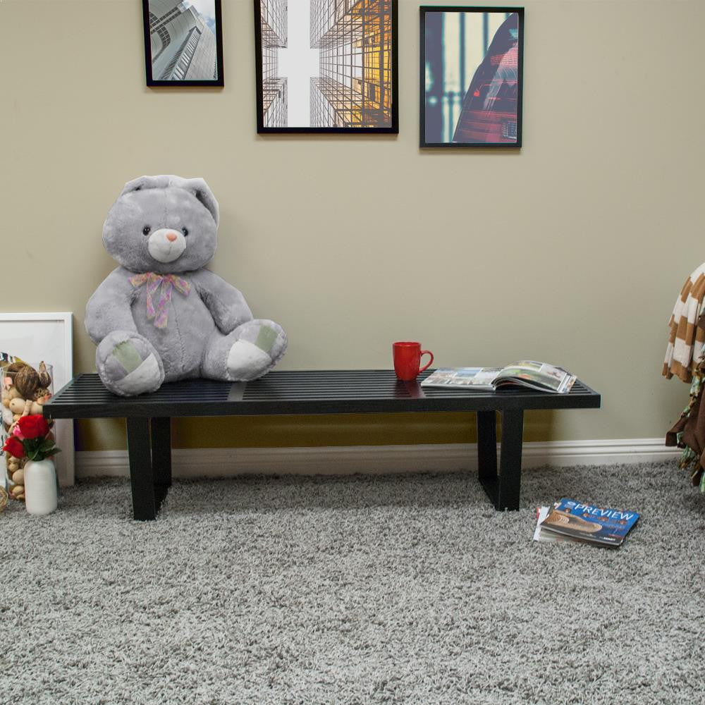 This slat bench, offered in two colors, is simple way to improve the look of any room or garden. The solid black legs and hardwood constructions make this bench built to last. The fine wood adds a subtle yet modern feel to any environment.