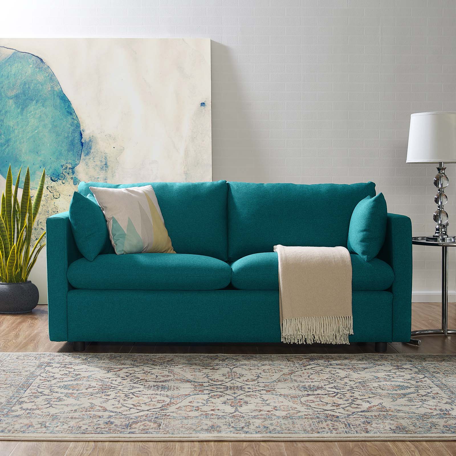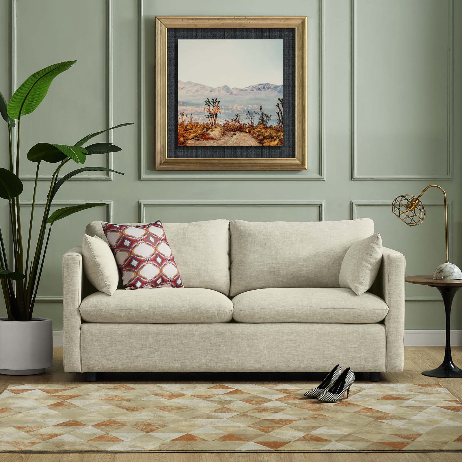 Lounge in style with Activate. A versatile addition to a family room, apartment, office, or small living space, Activate is a cozy modern sofa made with dense foam padding, and upholstered in soft polyester fabric. Rounded cushion corners and complementing accent pillows grant this sofa a contemporary look that’s echoed by its calming color, streamlined profile, and subtle wood legs. Say goodbye to the days of hauling heavy furniture. Activate offers modern-day convenience as it ships directly to your home or apartment in a portable, compact box. With a casual yet tailored aesthetic, this living room sofa easily unpacks to become a favorite lounge spot in your home. Sofa Weight Capacity: 1102 lbs. Set Includes: One - Activate Sofa