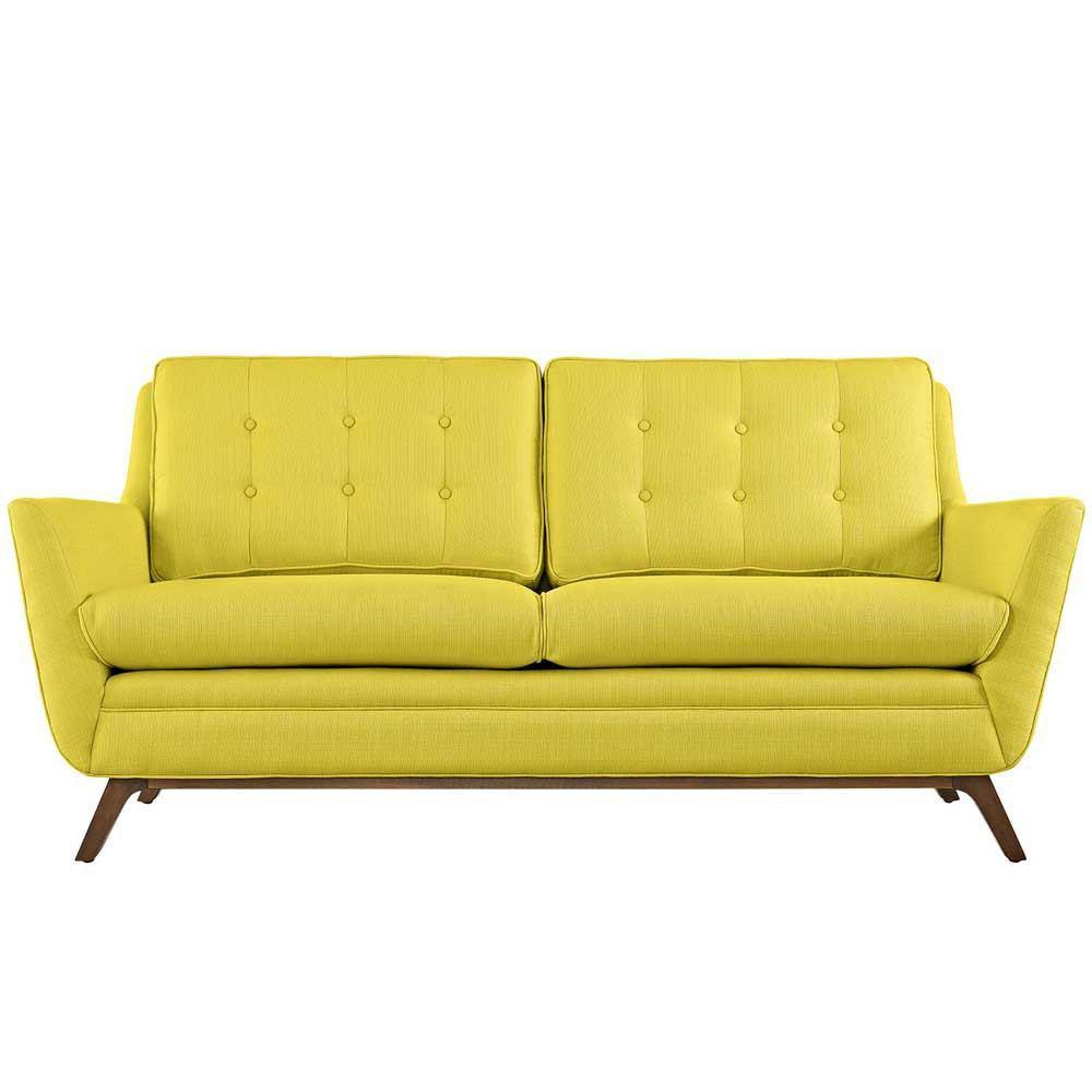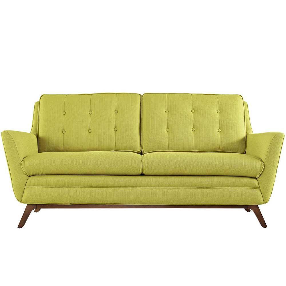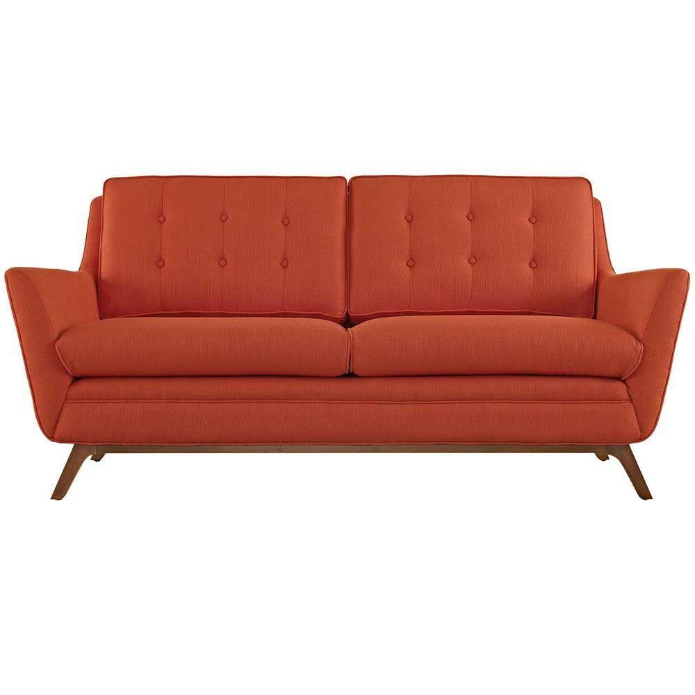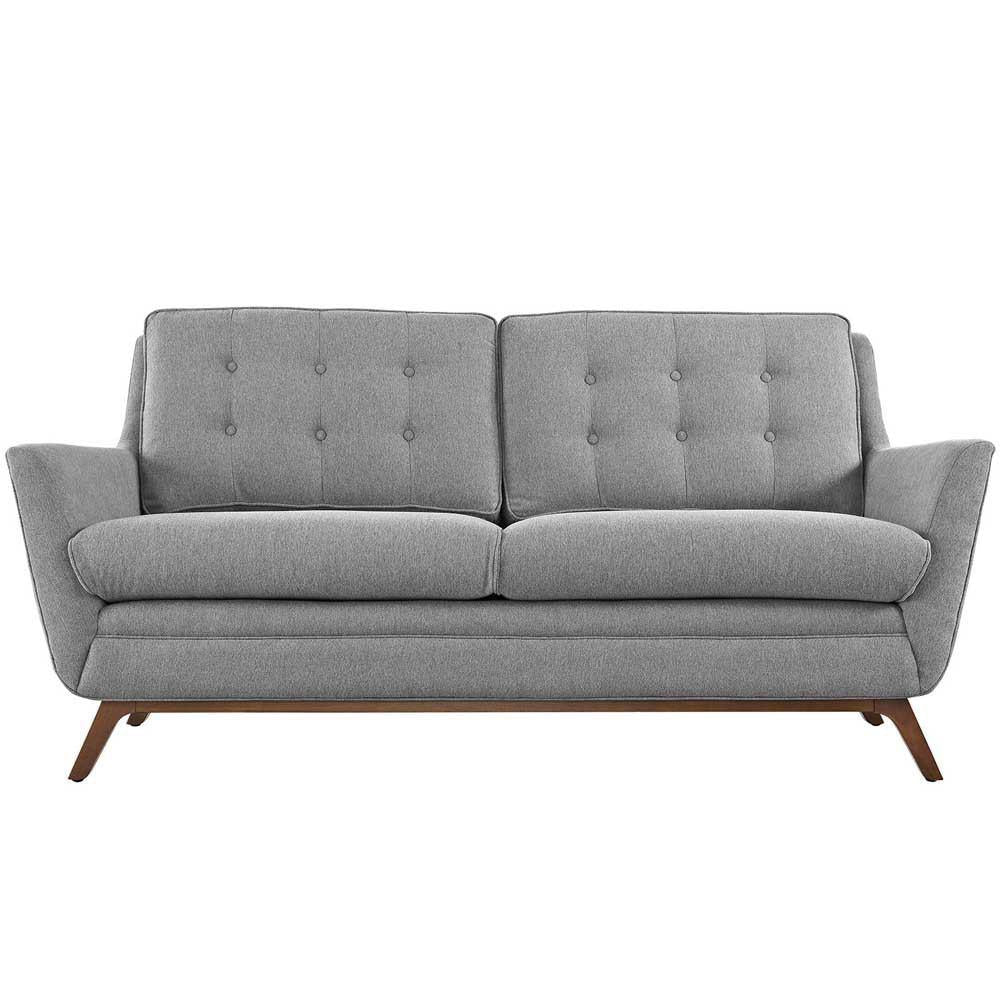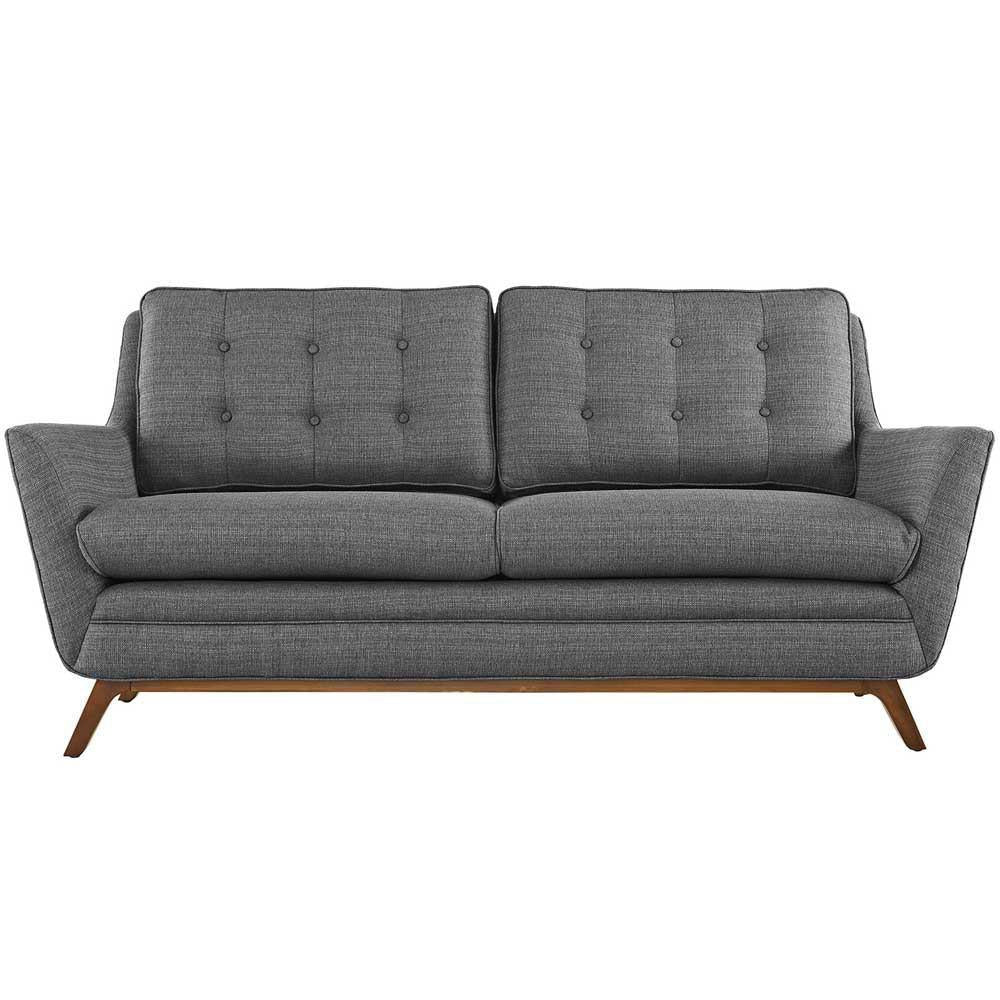 Dominate your decor with the expertly designed Beguile Fabric Loveseat. Exquisitely crafted with gently sloping arms, comfortable plush seat cushions, and adeptly tufted back cushion buttons, Beguile is a delightful collection that reinvents mid-century style. Outfitted with a solid wood walnut-stained base and finely upholstered fabric, Beguile comes perfect for living room, lounge and meeting areas. Set Includes: One - Beguile Loveseat