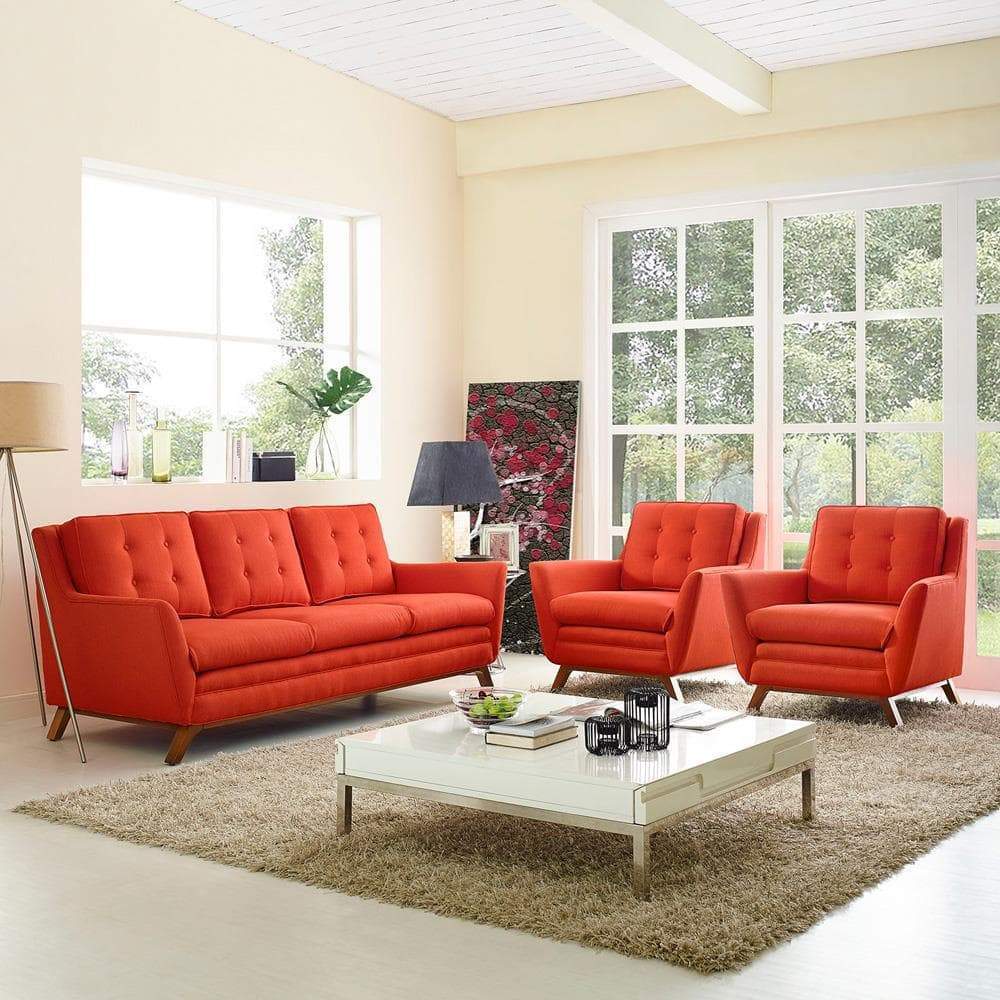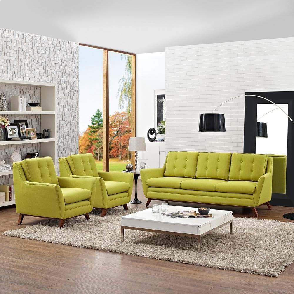 Dominate your decor with the expertly designed Beguile Collection. Exquisitely crafted with gently sloping arms, comfortable plush seat cushions, and adeptly tufted back cushion buttons, Beguile is a delightful collection that reinvents mid-century style. Outfitted with a solid wood walnut-stained base and finely upholstered fabric, Beguile comes perfect for living room, lounge and meeting areas.Set Includes:One - Beguile Fabric SofaTwo - Beguile Fabric Armchair
