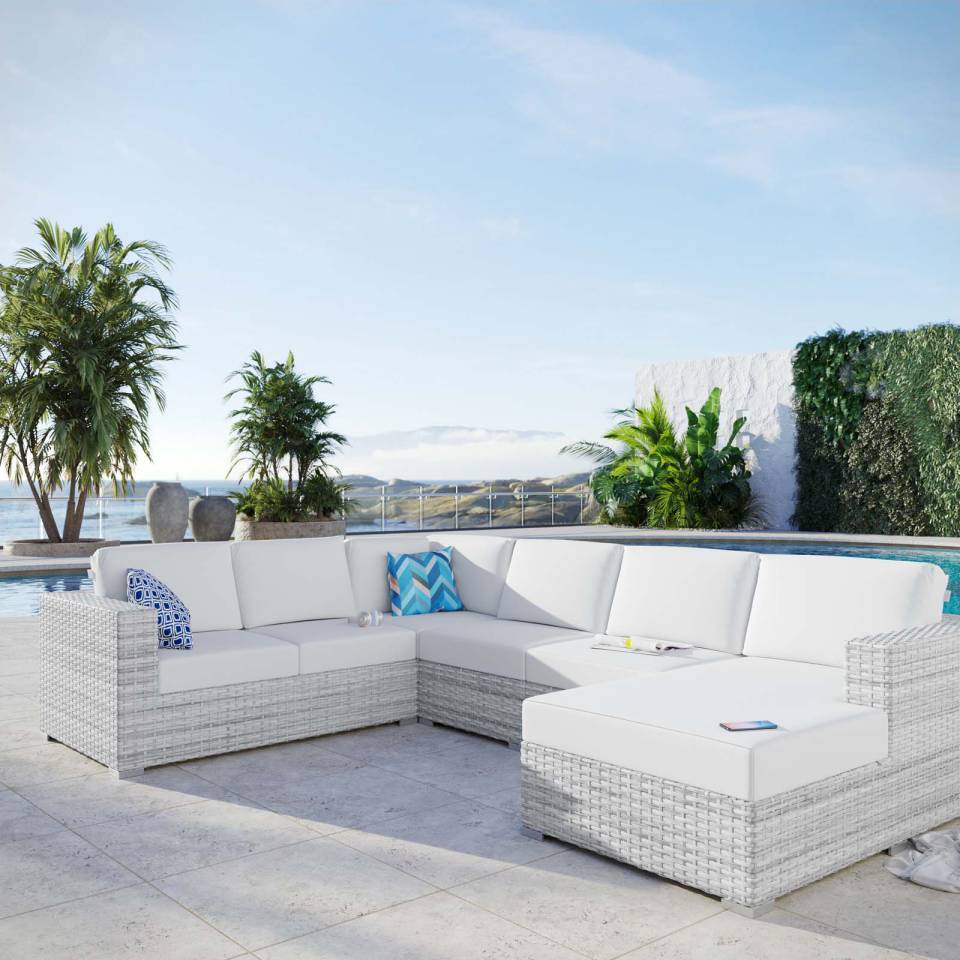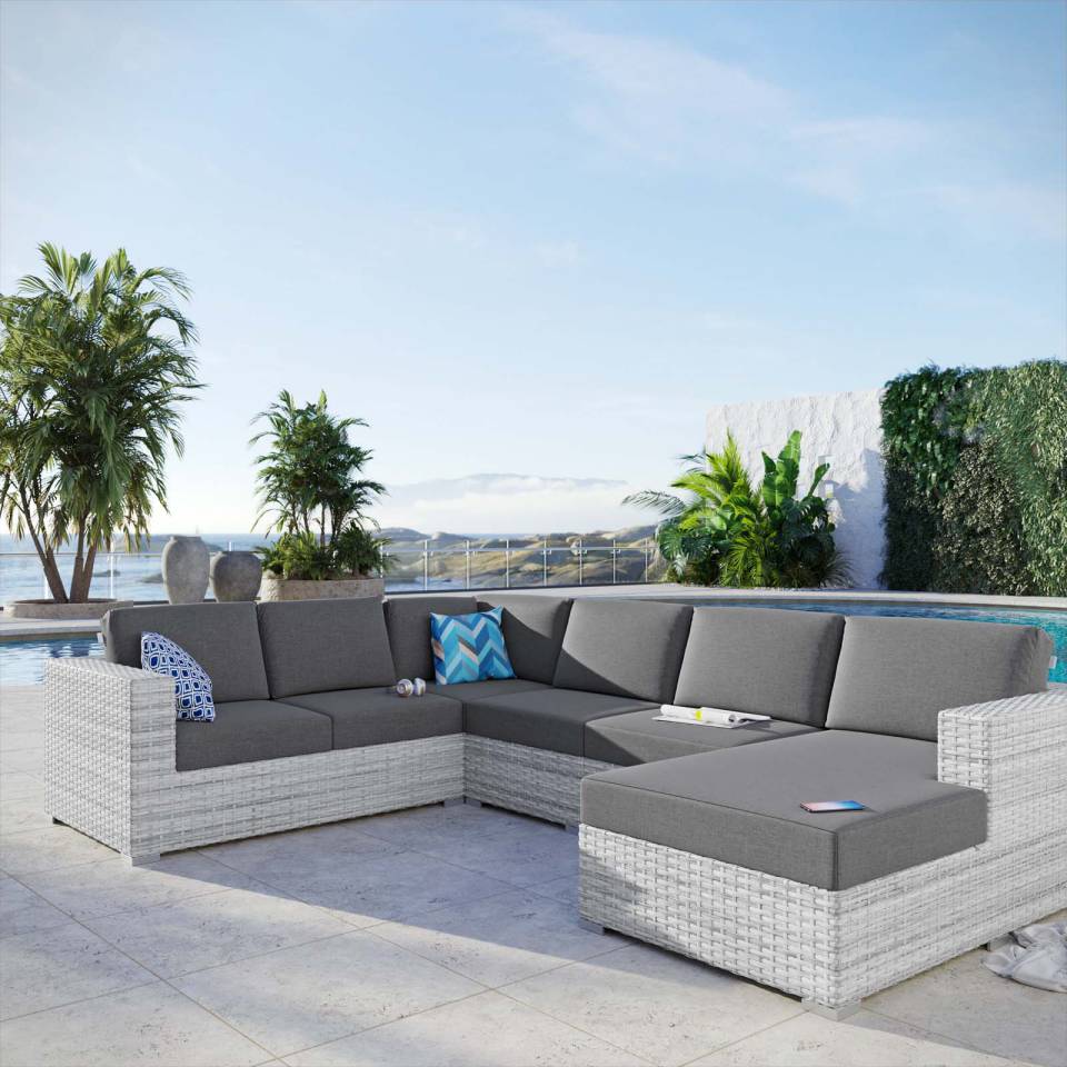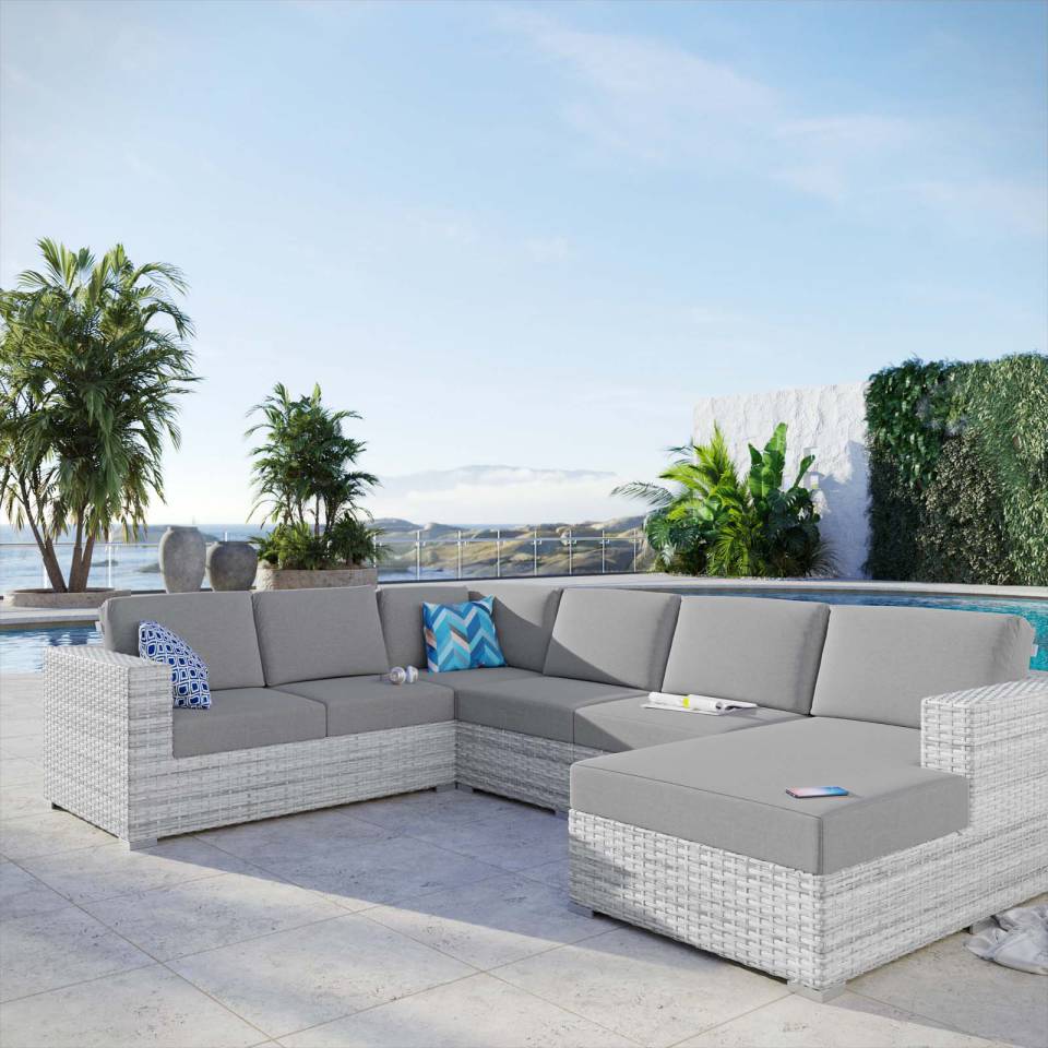 Gather stages of sensitivity with the Convene Outdoor Series. Made with a synthetic rattan weave and a powder-coated aluminum frame, Convene is a versatile outdoor furniture set that shifts and combines according to the spontaneous needs of the moment. Outfitted with all-weather fabric cushions, the Convene Sectional Set leaves a positive impression on friends and family while enhancing your patio, backyard, or poolside retreat with palpable distinction. This outdoor patio furniture set includes one corner chair, two armless chairs, one left-arm loveseat, and one right-arm chaise. Set Includes: One - Convene Corner Chair One - Convene Left-Arm Loveseat One - Convene Right Chaise Two - Convene Armless Chair