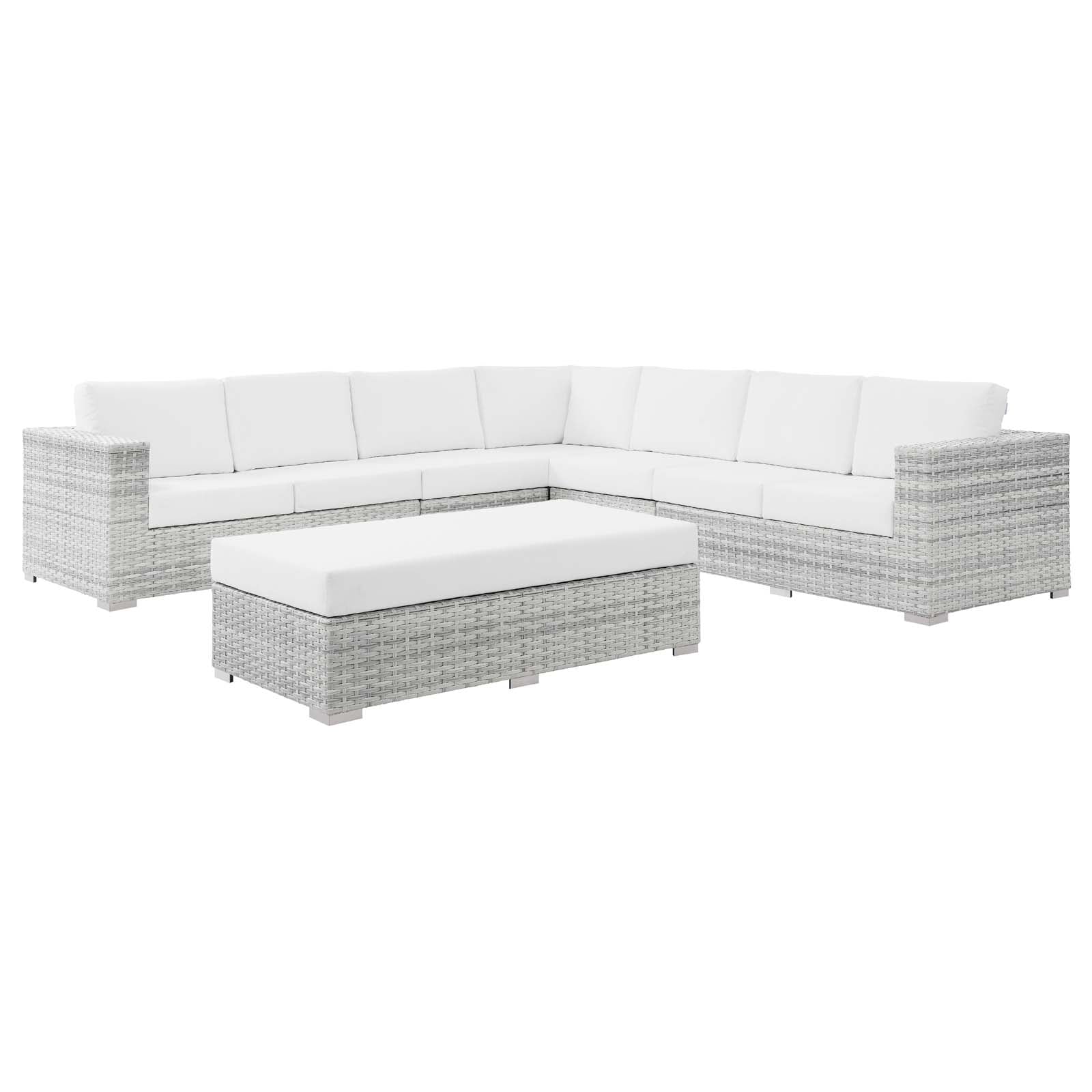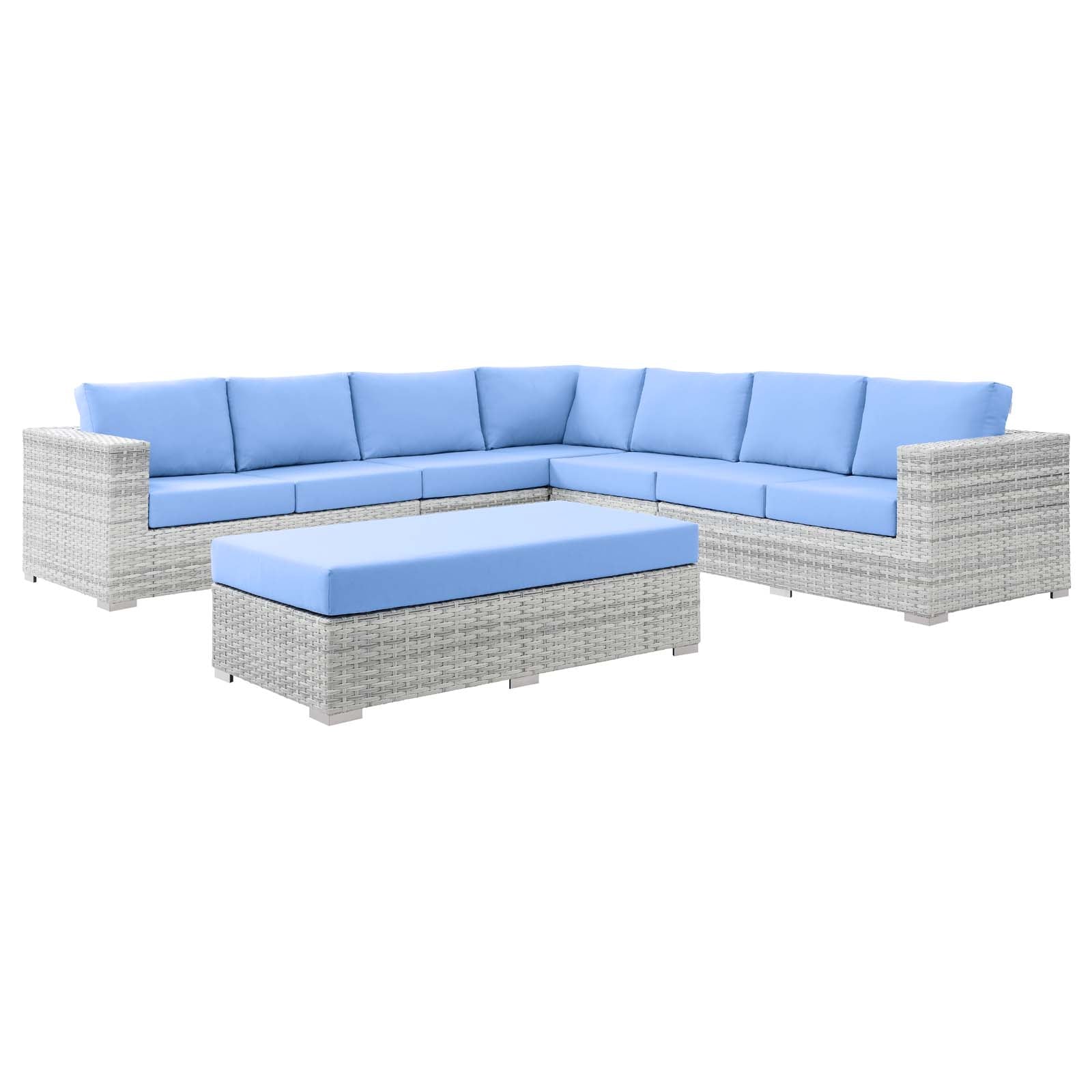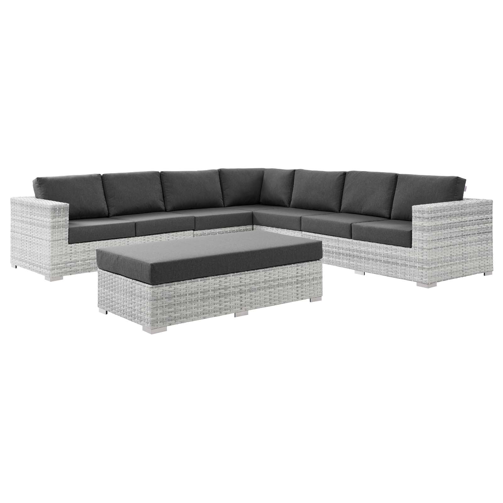 Gather stages of sensitivity with the Convene Outdoor Series. Made with a synthetic rattan weave and a powder-coated aluminum frame, Convene is a versatile outdoor furniture set that shifts and combines according to the spontaneous needs of the moment. Outfitted with all-weather fabric cushions, the Convene Sectional Set leaves a positive impression on friends and family while enhancing your patio, backyard, or poolside retreat with palpable distinction. This outdoor patio furniture set includes one corner chair, two armless chairs, one right-arm loveseat, one left-arm loveseat, and one rectangular ottoman. Set Includes: One - Convene Corner Chair One - Convene Left-Arm Loveseat One - Convene Rectangular Ottoman One - Convene Right-Arm Loveseat Two - Convene Armless Chair