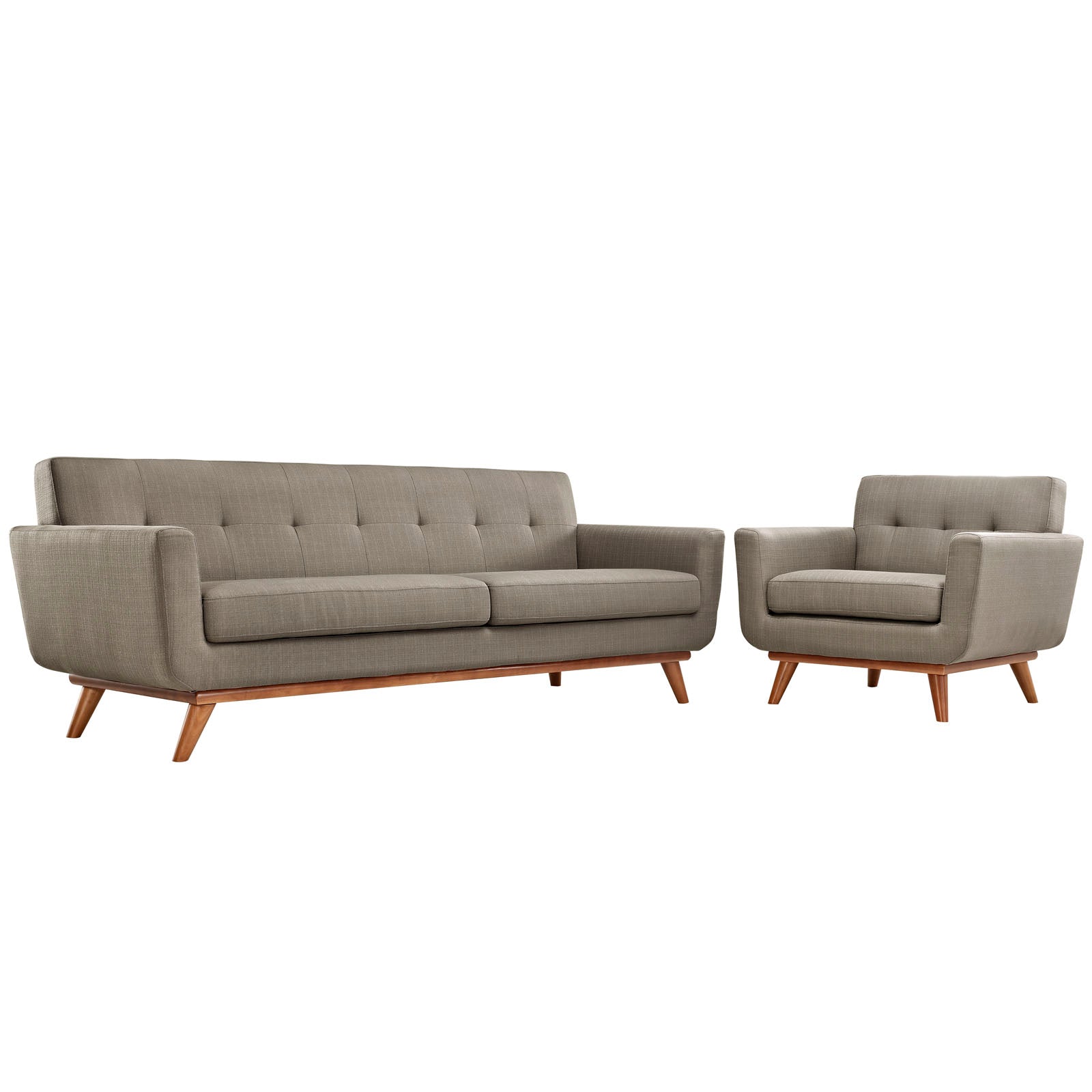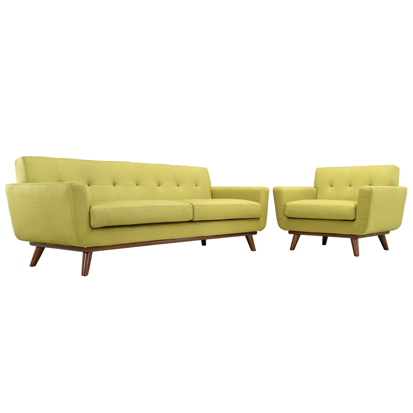 Gently sloping curves and large dual cushions create a favorite lounging spot. Whether plopping down after a long day at work, settling in with coffee and brunch, or entering a spirited discussion with friends, the Engage sofa is a welcome presence in your home. Seven tufted buttons create eye-catching appeal, adding depth that brings your sitting décor to center stage. Four cherry color rubberwood legs and frame supply a solid base to the comfortable upholstered material. Set Includes: One - Engage Armchair with wood Legs One - Engage Sofa with wood legs