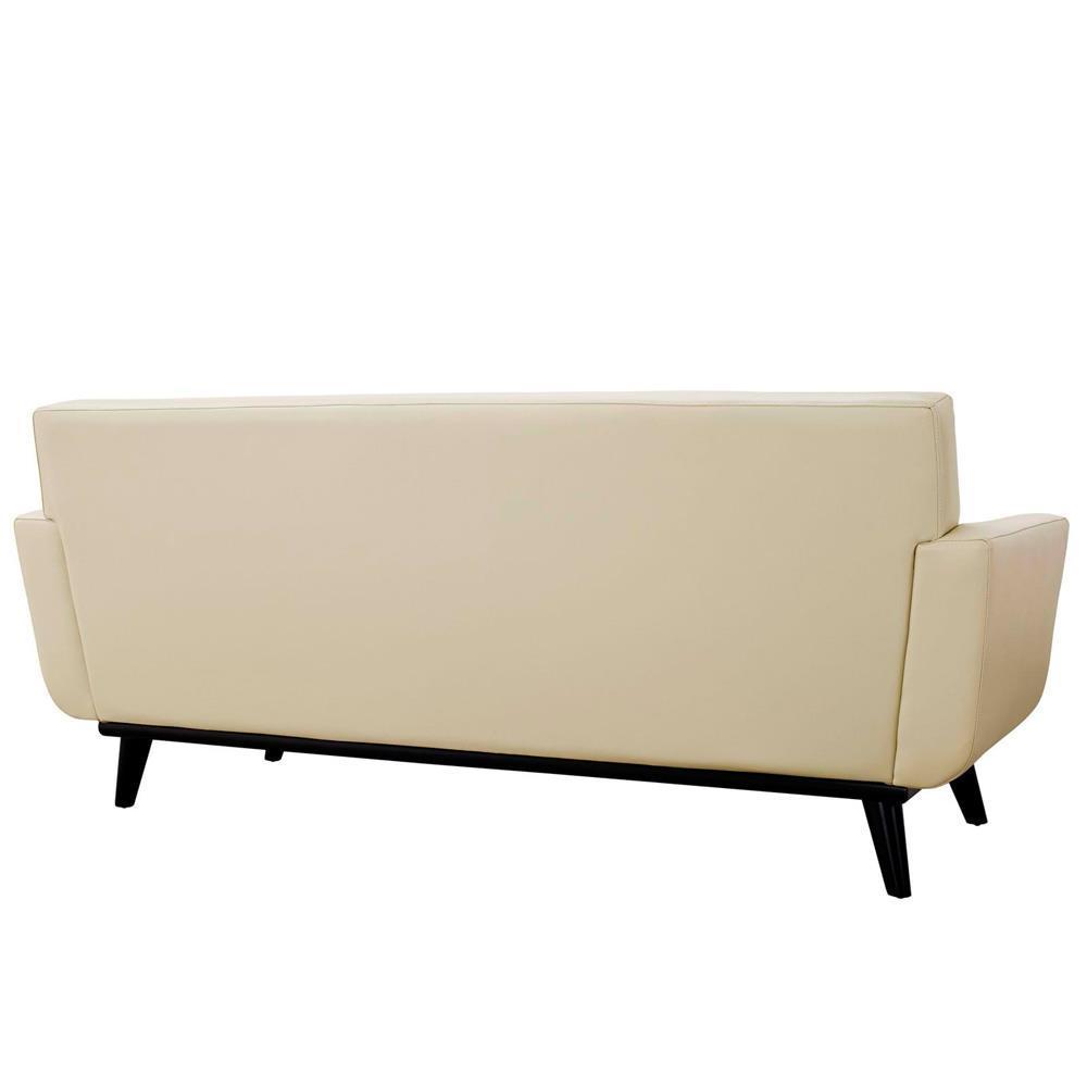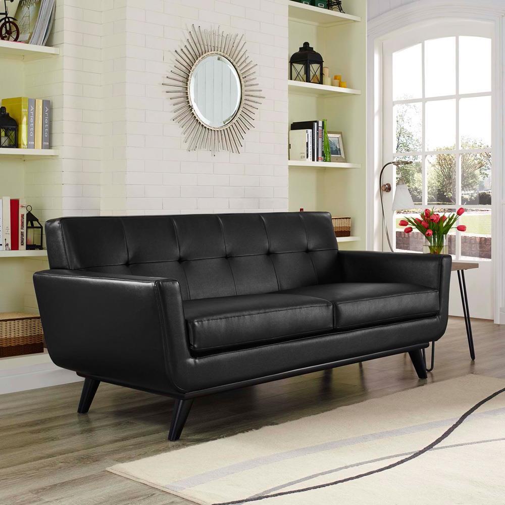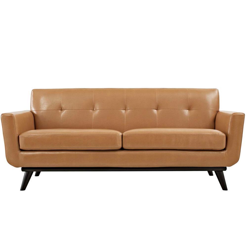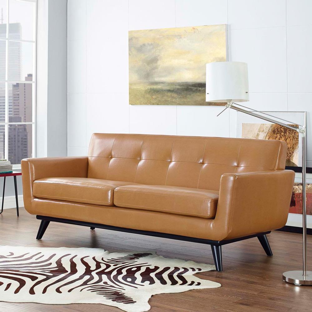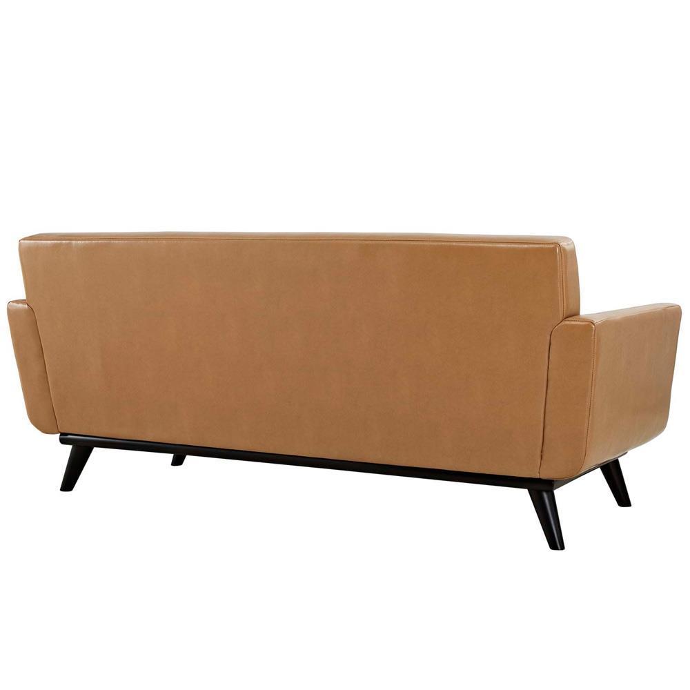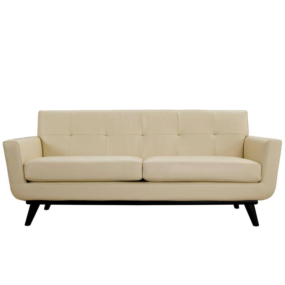 Gently sloping curves and large dual cushions of Modway Engage Bonded Leather Loveseat creates a favorite lounging spot. Whether plopping down after a long day at work, settling in with coffee and brunch, or entering a spirited discussion with friends, the Engage loveseat is a welcome presence in your home. Five buttons create eye catching appeal; adding depth that brings your sitting decor to center stage. Four cherry color rubber wood legs and frame supply a solid base to the comfortable quality leather. Set Includes: One - Engage Leather Armchair with wood Legs