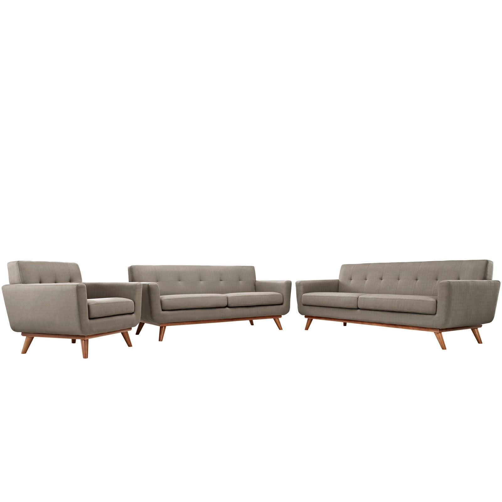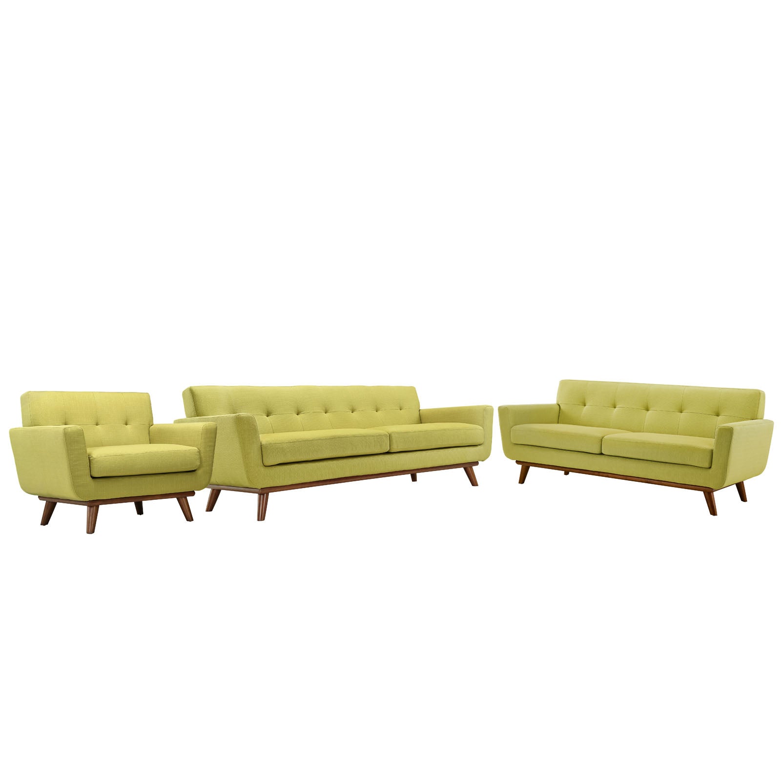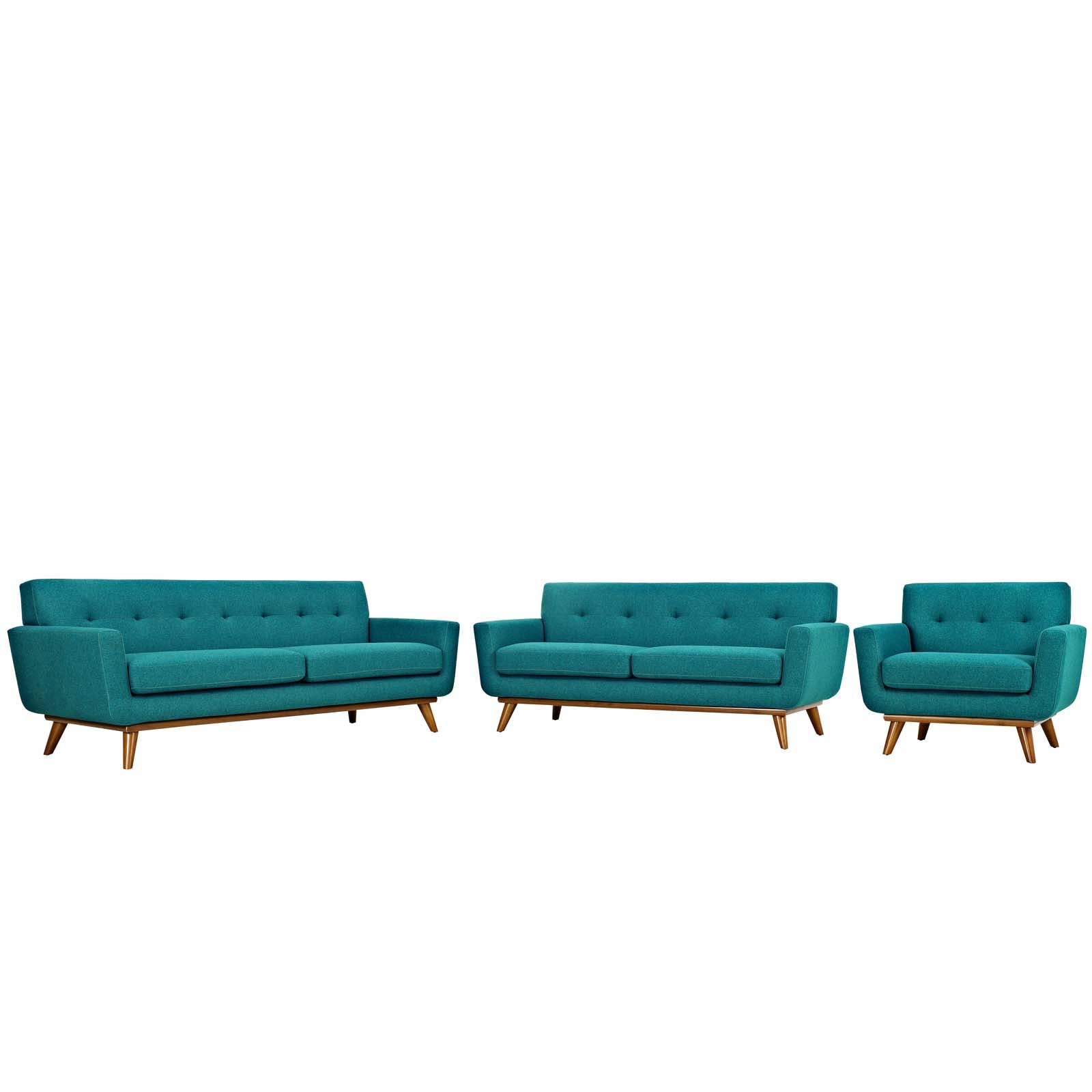 Gently sloping curves and large dual cushions create a favorite lounging spot with Engage Upholstered Fabric Button Tufted Sofa Furniture Series. Whether plopping down after a long day at work, settling in with coffee and brunch, or entering a spirited discussion with friends, the Engage Upholstered Fabric Button Tufted Sofa, Loveseat and Armchair set is a welcome presence in your home. Seven tufted buttons create eye-catching appeal, adding depth that brings your sitting décor to center stage. Four cherry color rubberwood legs and frame supply a solid base to the comfortably durable and stain-resistant upholstery. Set Includes: One - Engage Armchair with wood Legs One - Engage Loveseat with wood Legs One - Engage Sofa with wood Legs
