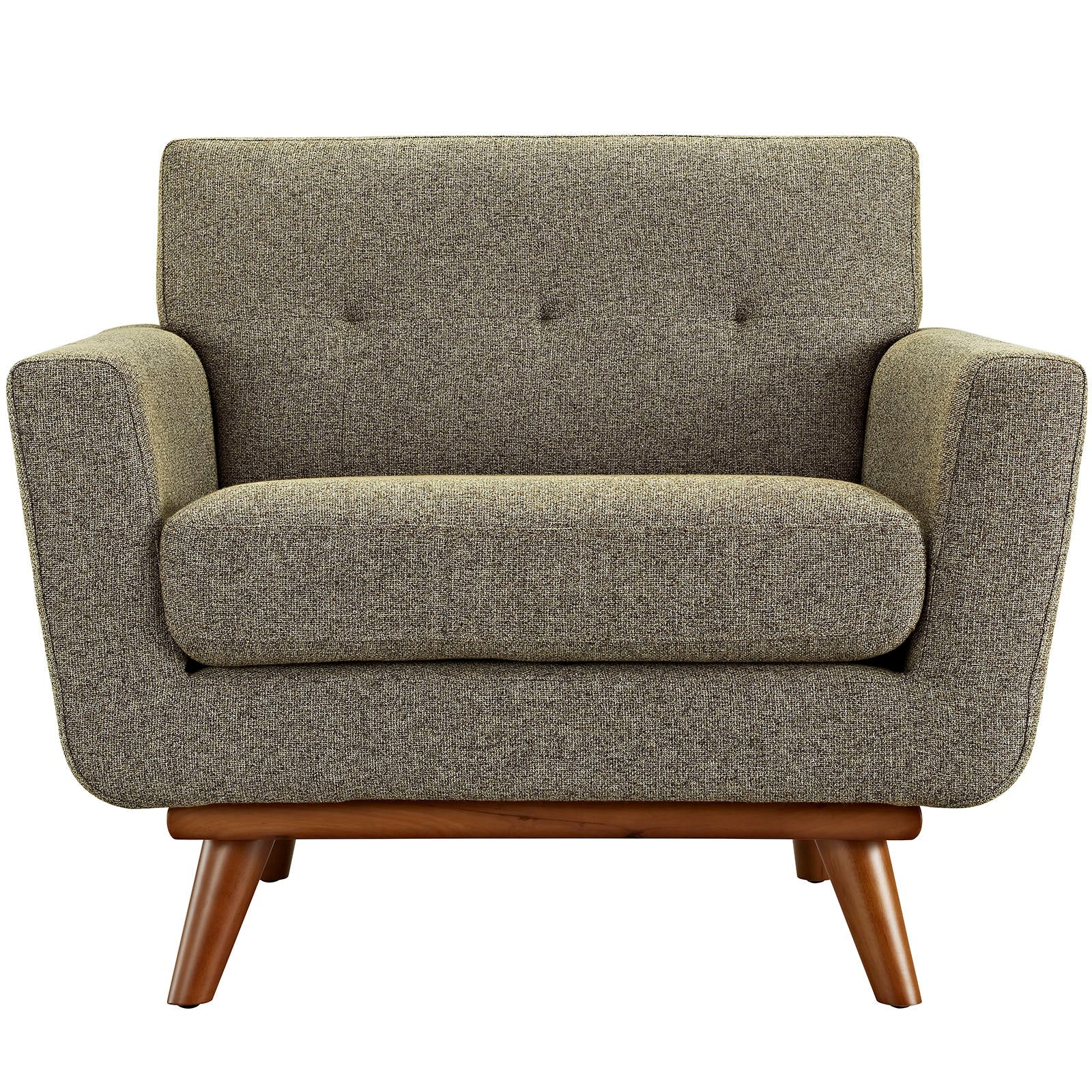 Gently sloping curves and plush seat cushion create a favorite lounging spot. Whether relaxing after a long day at work, settling in with coffee and brunch, or entering a spirited discussion with friends, the Engage Armchair is a welcome presence in your home. Three tufted buttons create eye-catching appeal, adding depth that brings your sitting décor to center stage. Four cherry color rubberwood legs and frame supply a solid base to the comfortable upholstered material. Set Includes: One - Engage Armchair