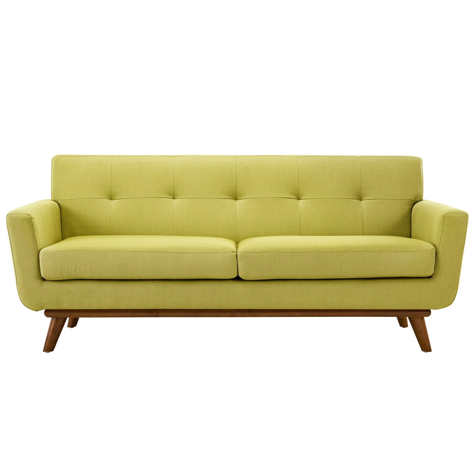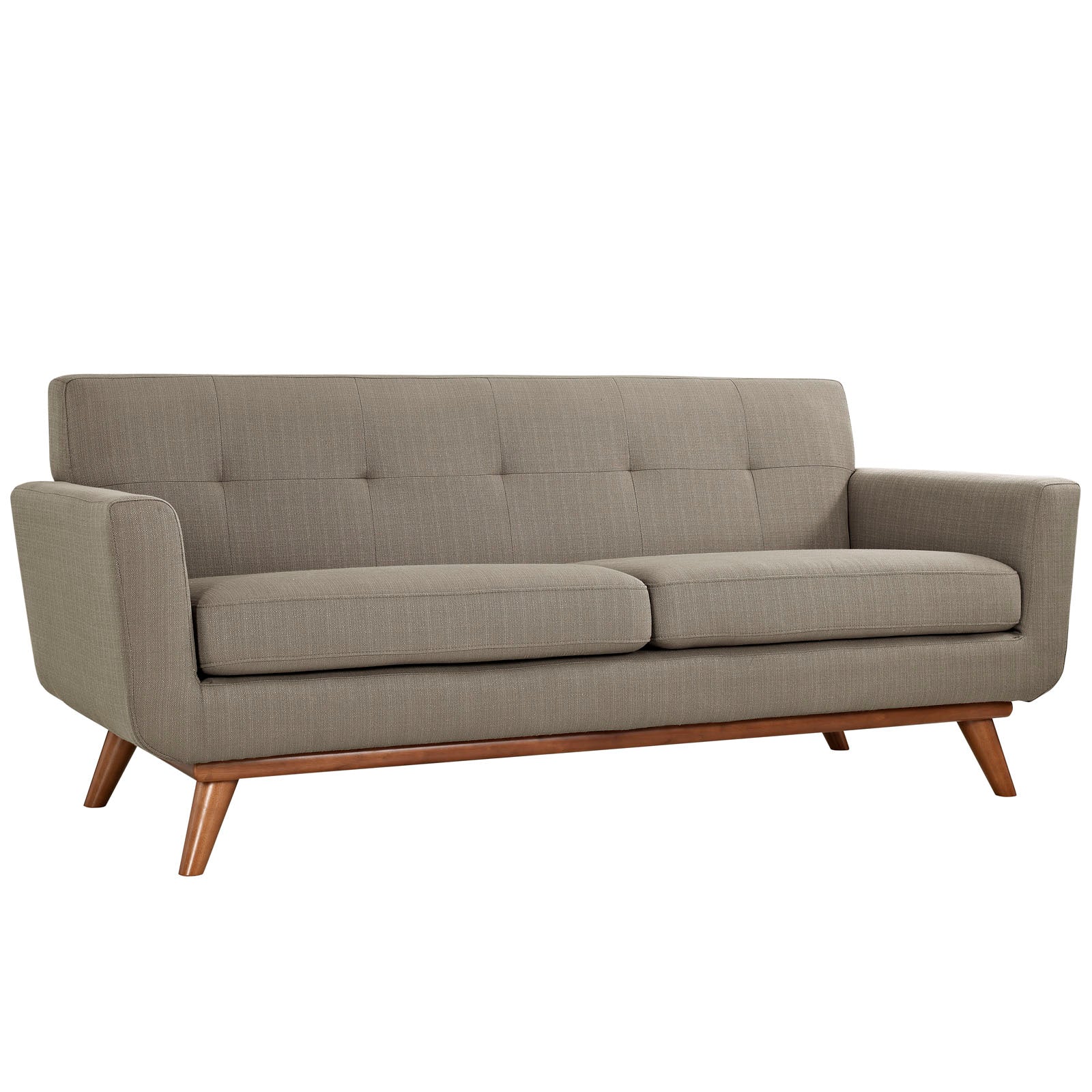 Gently sloping curves and large dual cushions create a favorite lounging spot. Whether relaxing after a long day at work, settling in with coffee and brunch, or entering a spirited discussion with friends, the Engage loveseat is a welcome presence in your home. Five tufted buttons create eye-catching appeal, adding depth that brings your sitting décor to center stage. Four cherry color rubberwood legs and frame supply a solid base to the comfortable upholstered material. Set Includes: One - Engage Loveseat
