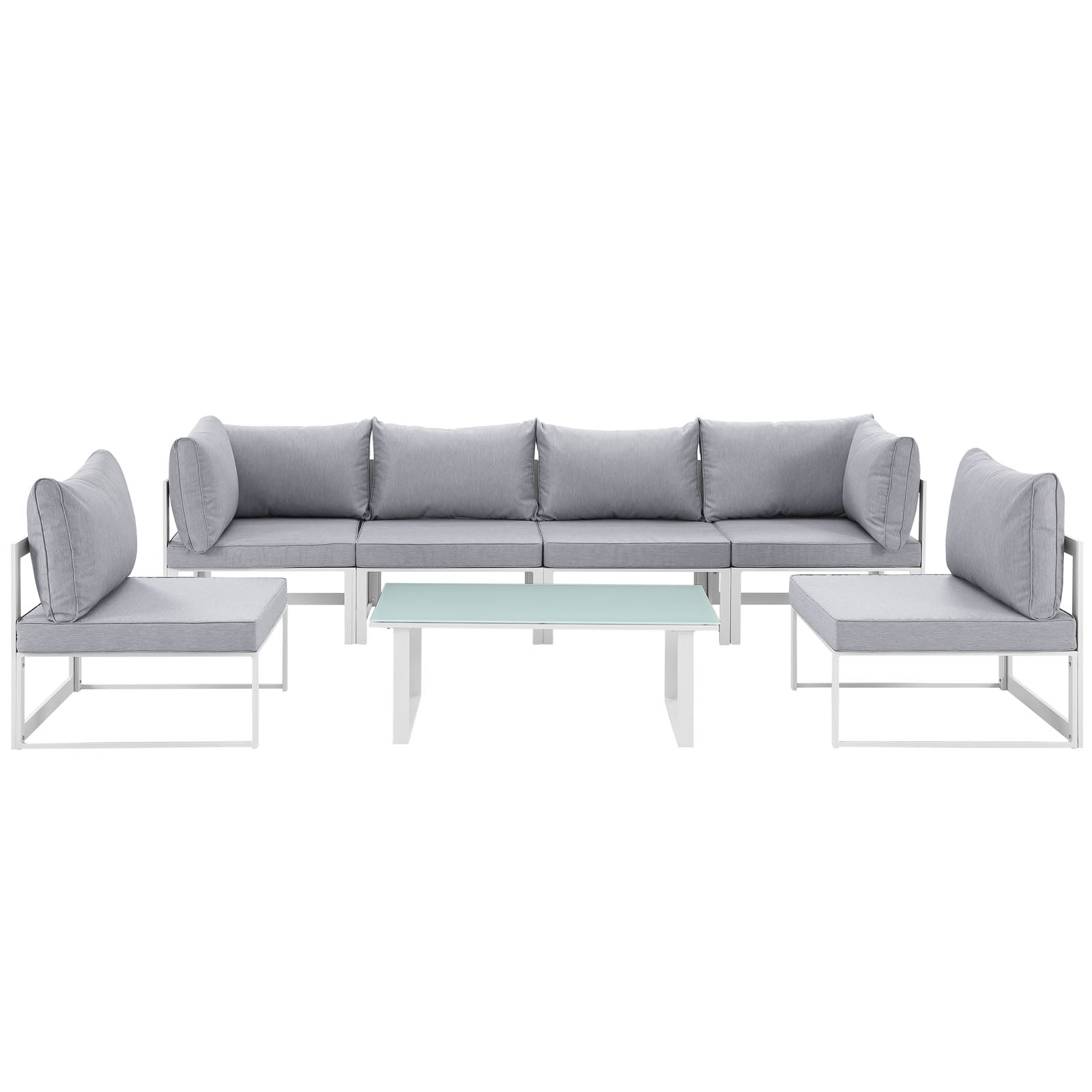 Nestled within close proximity to forests, rivers, valleys, and the Pacific Ocean rests the Fortuna Outdoor Patio Collection. Enjoy the good life with the versatile Fortuna Patio Sectional Sofa Set in an engaging arrangement that makes it easy to enjoy conversations together with friends and family. Made of powder-coated aluminum with all-weather polyester cushions, Fortuna Outdoor Patio Sofa Set appeals to the modern palate without overwhelming the senses. This installment of the Fortuna Outdoor Series is a 7 piece patio sectional sofa furniture set perfect for contemporary patios, backyards, poolside, and other outdoor lounge areas. Set Includes: Four - Center One - Coffee Table Two - Corner