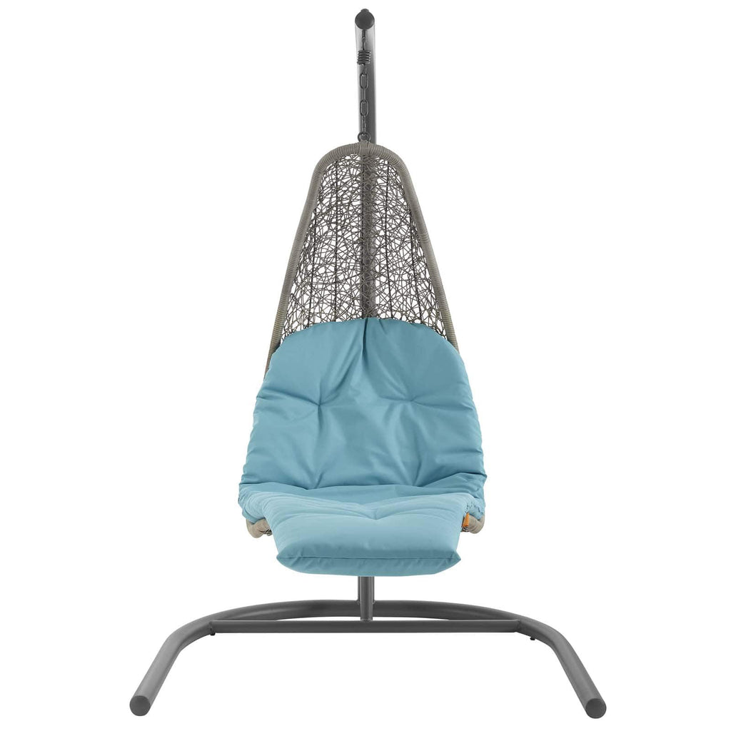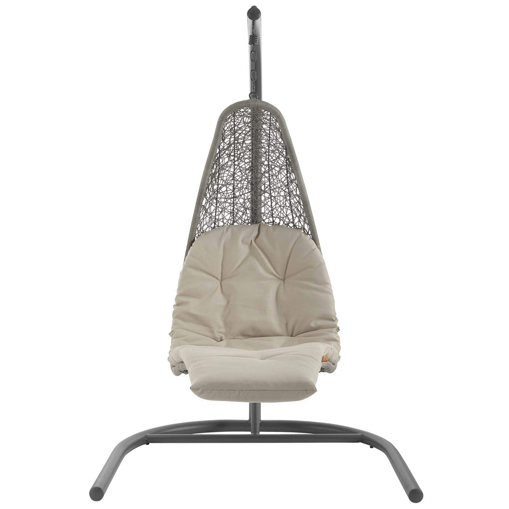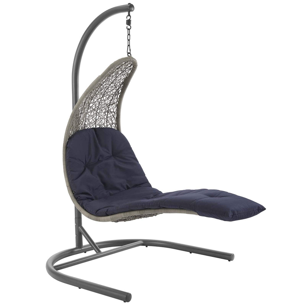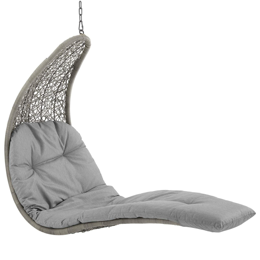 Escape to a place of relaxation with the Landscape Outdoor Patio Hanging Chaise Lounge Swing Chair. Wrapped with a textured synthetic rattan light gray and tan weave, this outdoor chaise lounger features a plush padded cushion upholstered in all-weather polyester fabric for lasting comfort. Hanging from a powder-coated steel frame, Landscape's organic design and sleek profile bring contemporary style to your outdoor patio, backyard, porch, or poolside. Sit back and relax with your feet up while enjoying warm weather and the calming movement of this outdoor porch swing. Includes stand and chain. Hanging Weight Capacity: 264 lbs. Set Includes: One - Landscape Hanging Chaise Lounge Swing Chair