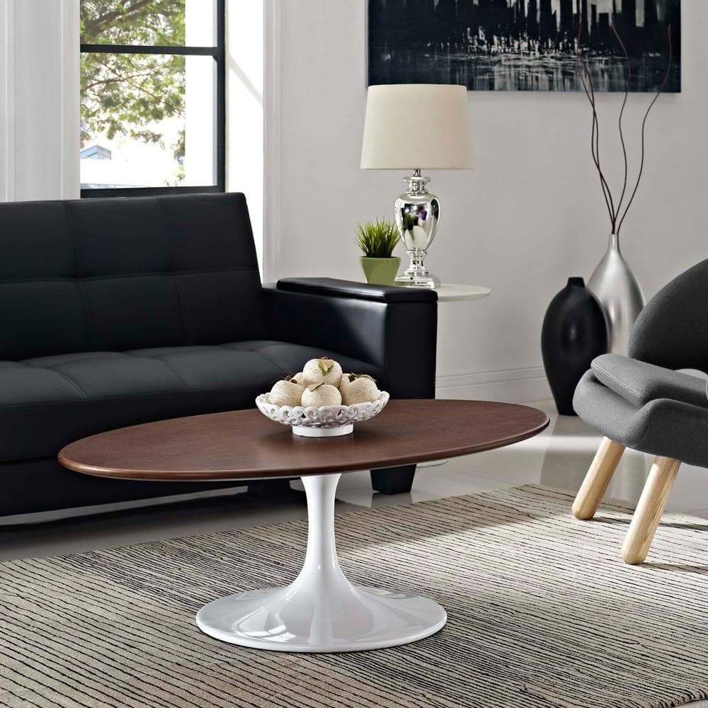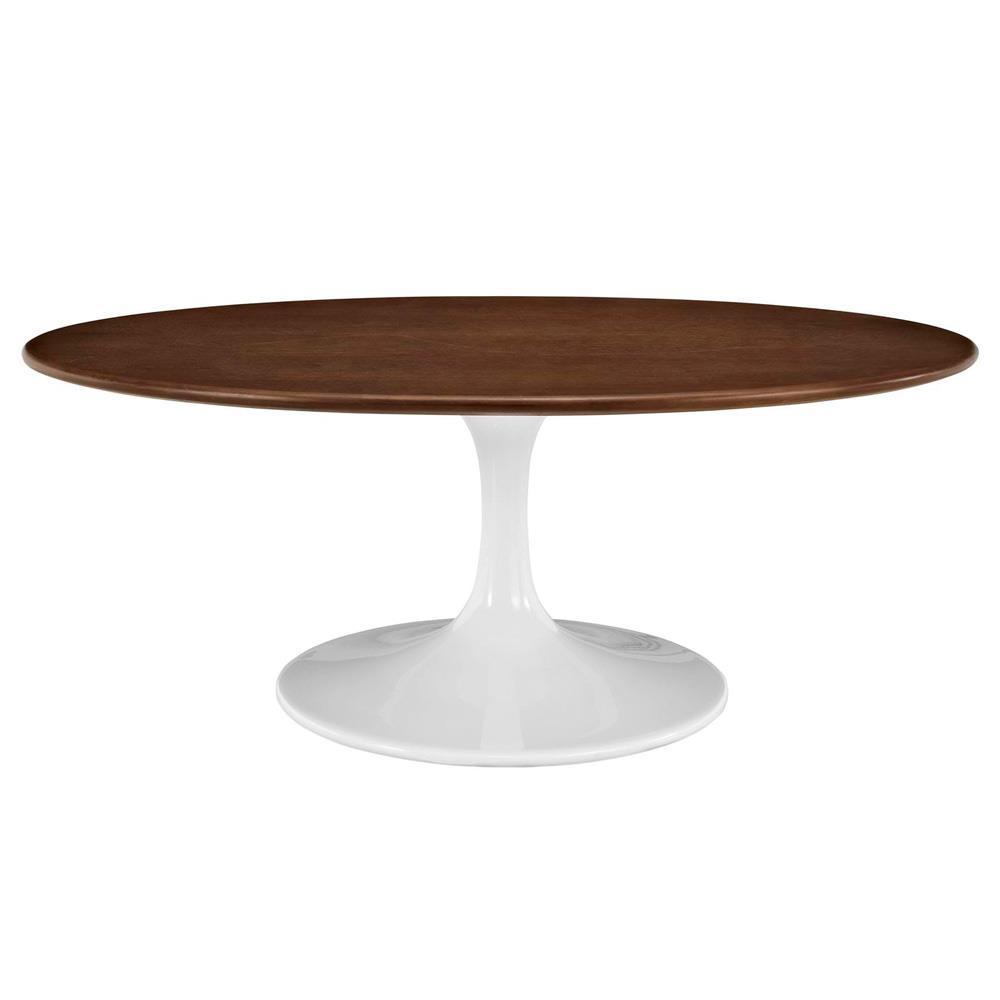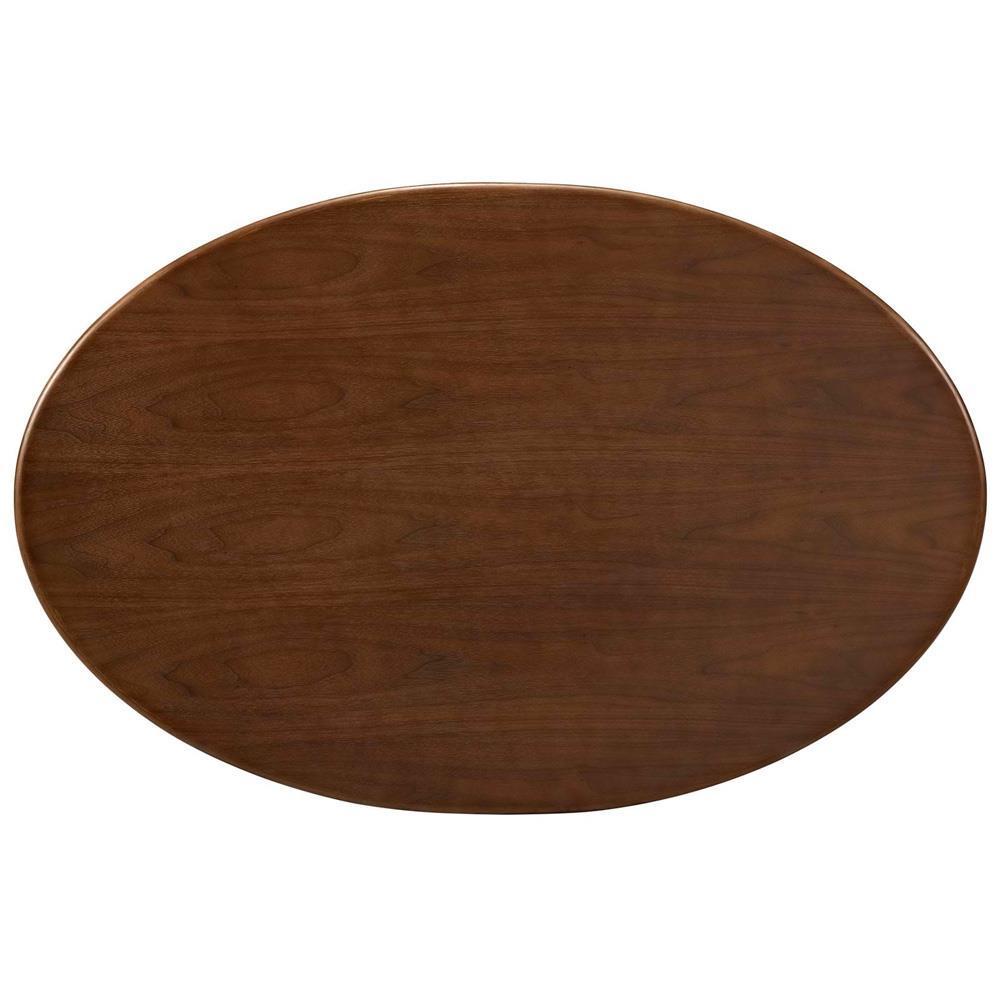 The base and dimensions are true to the original specifications, while the table's oval-shaped walnut veneer top, and tapered metal base, are carefully lacquered with a chip resistant finish.