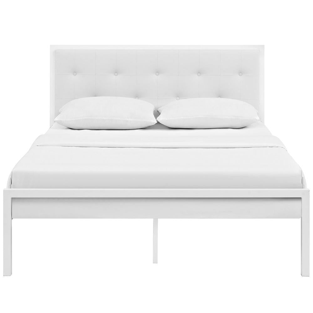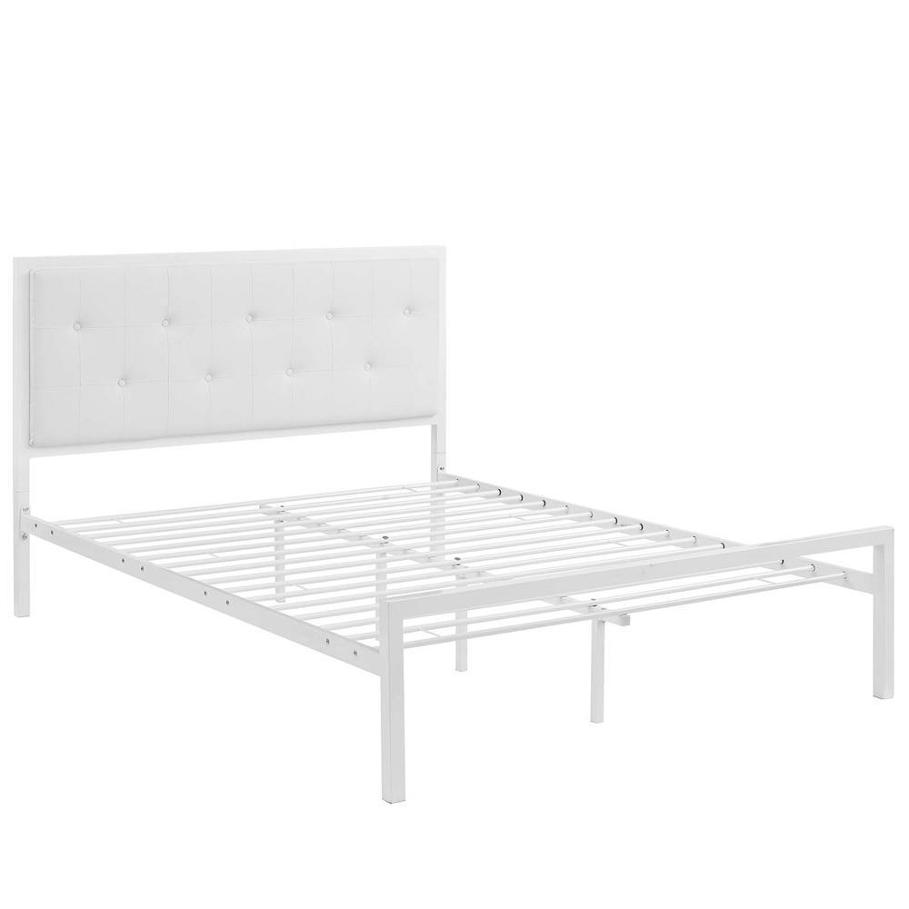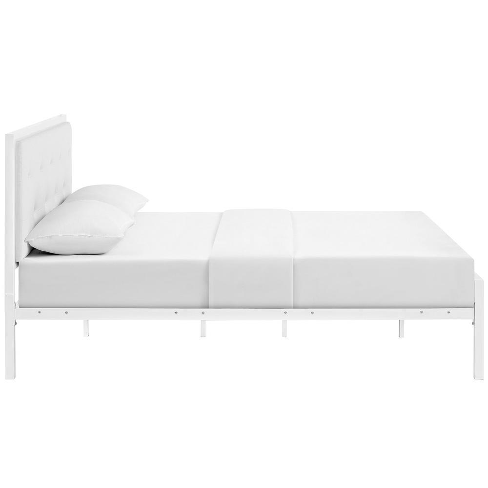 Rest easy knowing you've purchased a platform bed solid in both style and construction. Lottie features a sturdy steel frame that eliminates the need for a box spring, and admirably supports the various mattress types on the market such as memory foam, spring, latex and hybrid. Complete with a finely tufted headboard in vinyl, two reinforced center beams with support legs, non-marking foot caps, and up to 1300lb weight capacity, Lottie is a refreshingly built bed perfect for the modern home. Mattress Not Included.Set Includes:One - Lottie King Bed Frame