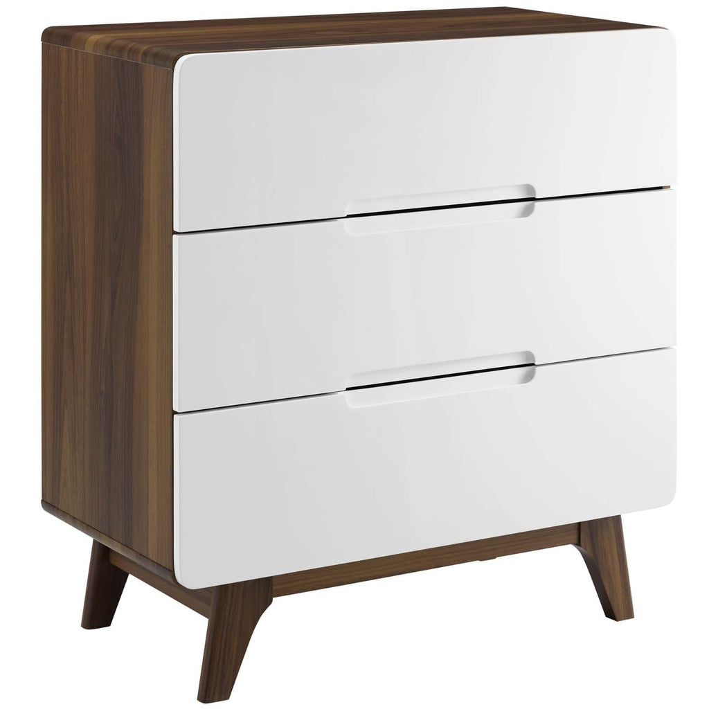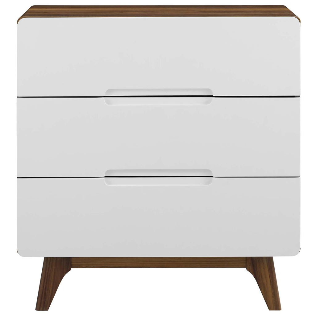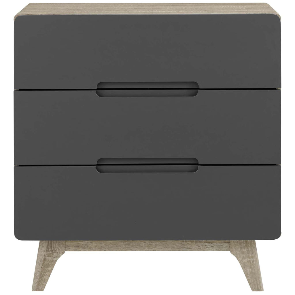 Bring the iconic energy of mid-century style to your bedroom or living room with the Origin Three-Drawer Chest or Stand. Crafted with durable fiberboard for reliable support, Origin comes with a splayed frame, rounded edges, linear design, wood grain laminate, and three full-extension drawers for concealed storage. The perfect complement to your bedroom or living room decor, display and store pictures, home accessories, clothes, and more with this contemporary modern chest or stand. Set Includes: One - Origin Three-Drawer Chest or Stand
