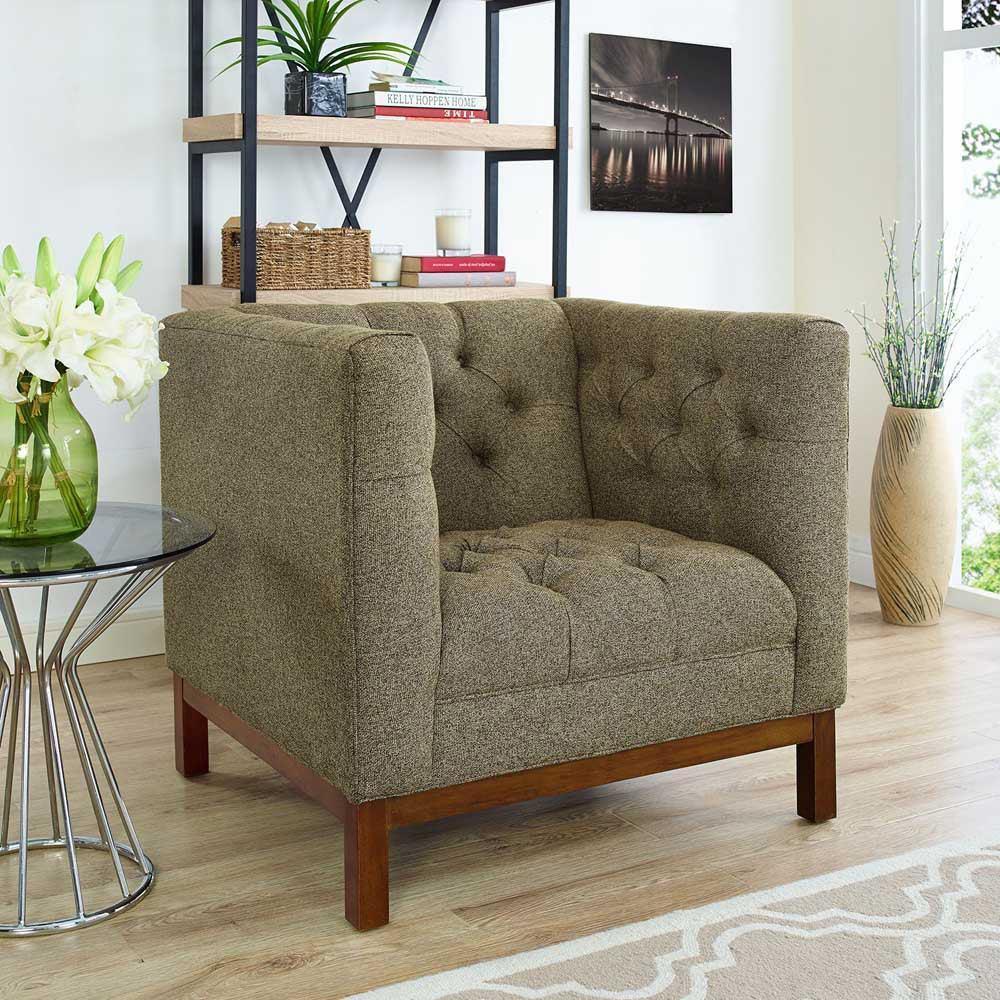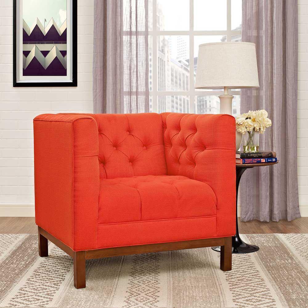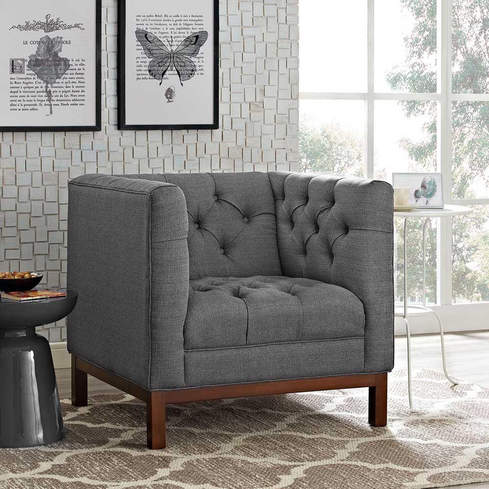 Add vivacity to your decor with the Panache Collection. Designed to express elegance and comfort, Panache Fabric Armchair comes outfitted with deeply tufted buttons and plush cushions for a timeless charm. Constructed of solid wood legs, fine fabric upholstering, and a reinvented mid-century style design with a dash of vintage charm, enhance your living room, lounge or meeting area with the Panache Collection. Set Includes: One - Panache Armchair
