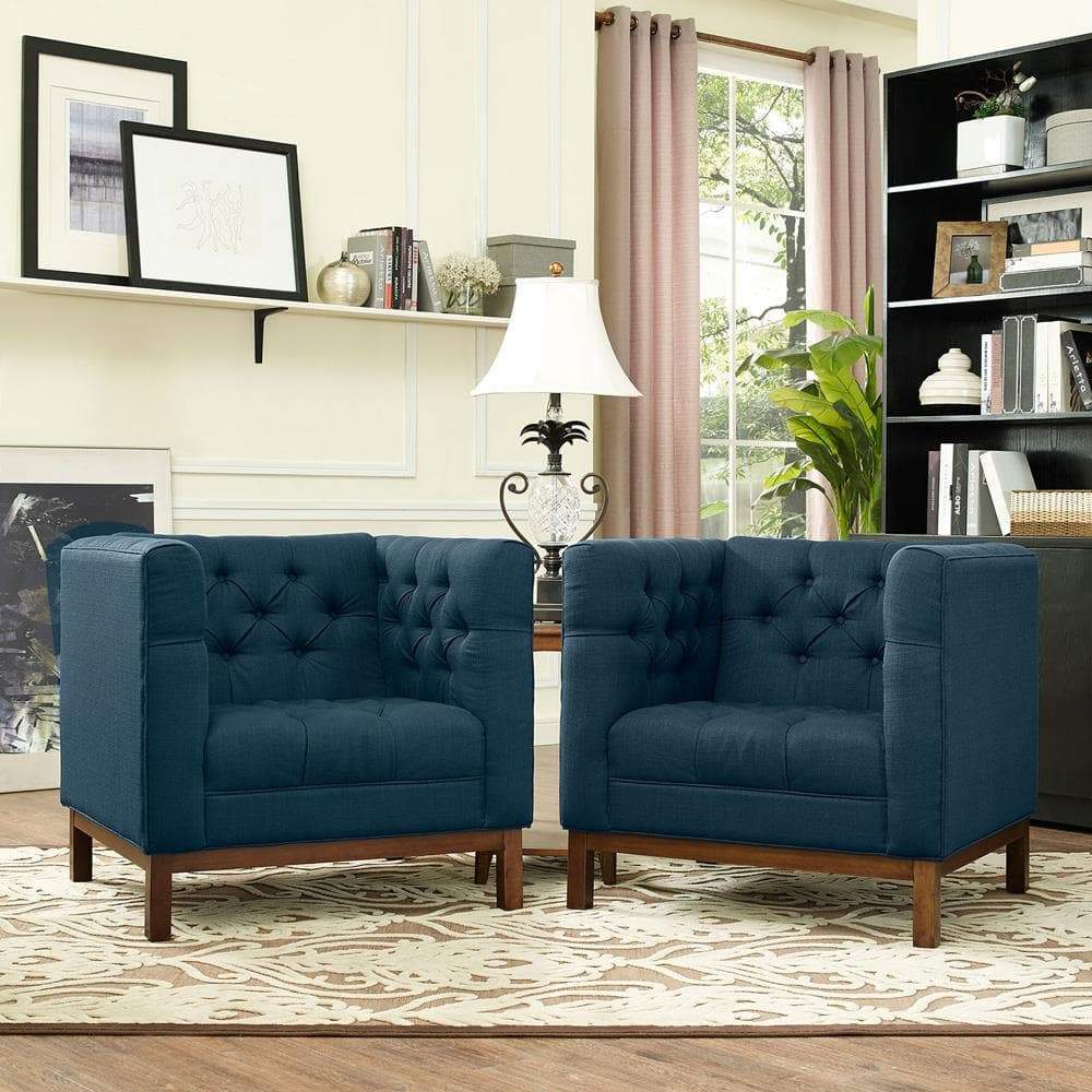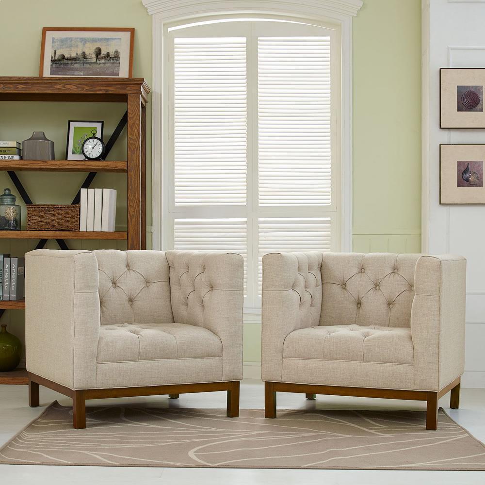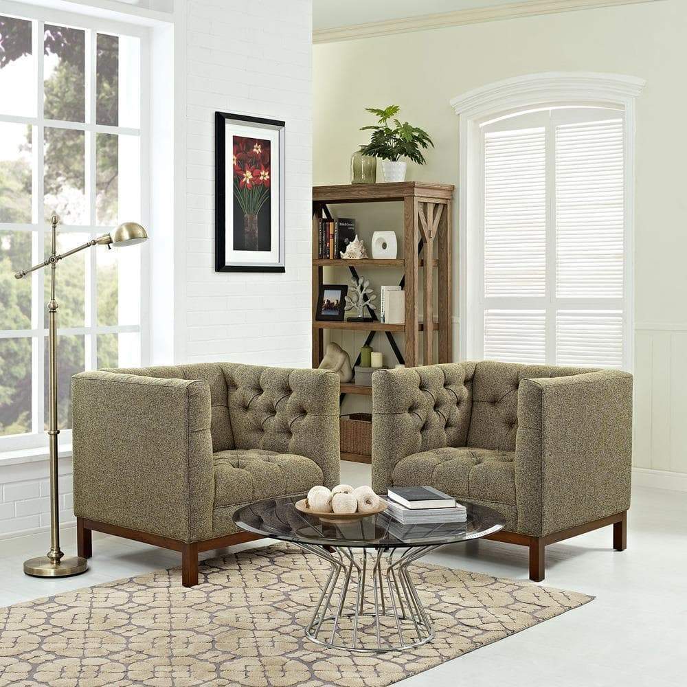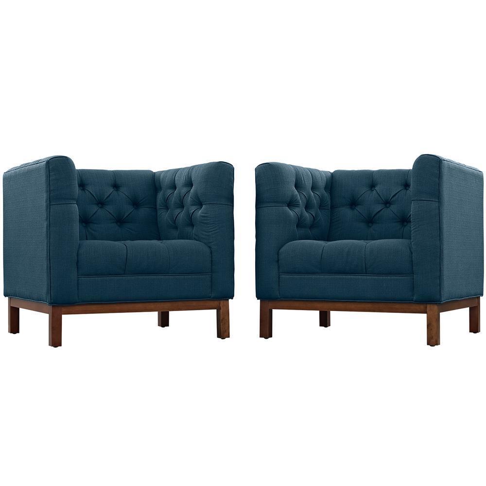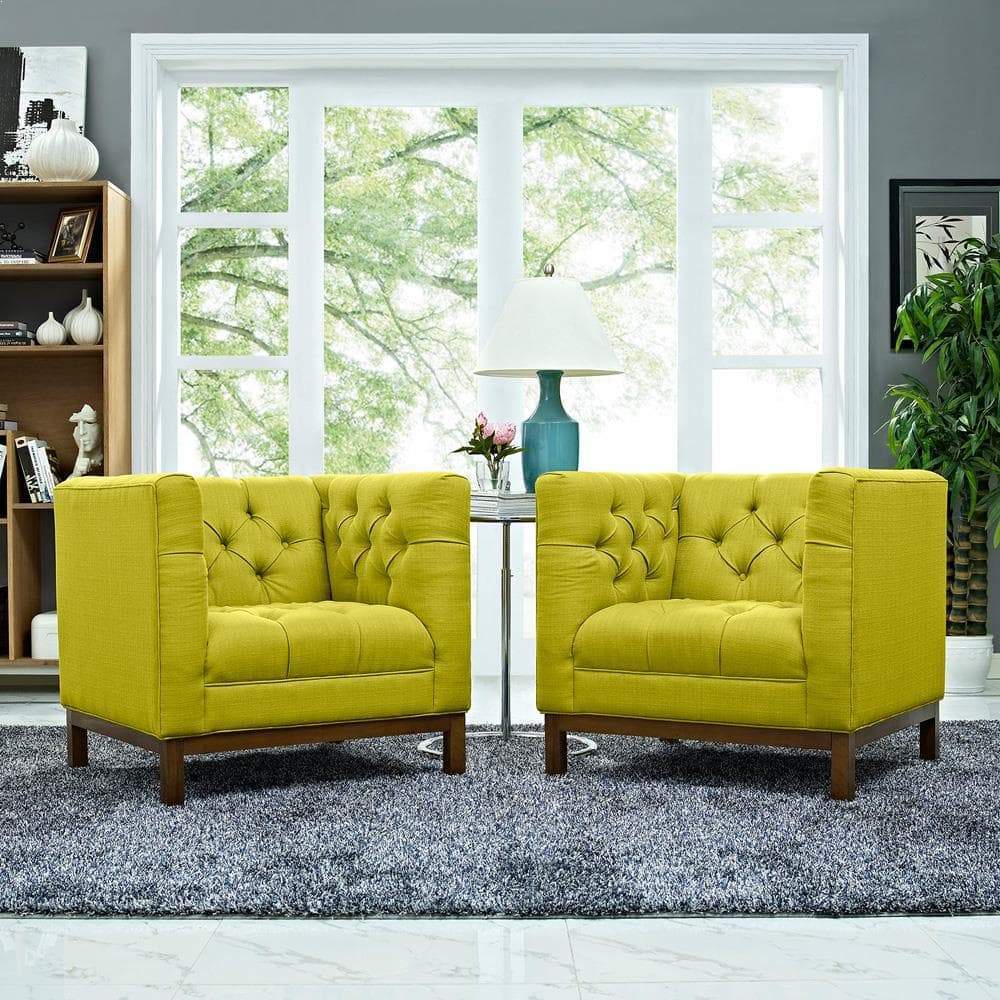 Add vivacity to your décor with the Panache Collection. Designed to express elegance and comfort, Panache comes outfitted with deeply tufted buttons and plush cushions for a timeless charm. Constructed with solid wood legs, fine fabric upholstering, and a reinvented mid-century style design with a dash of vintage charm, enhance your living room, lounge or meeting area with the Panache Collection. Set Includes: Two - Panache Fabric Armchair