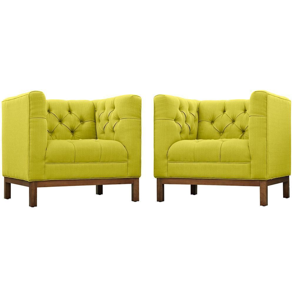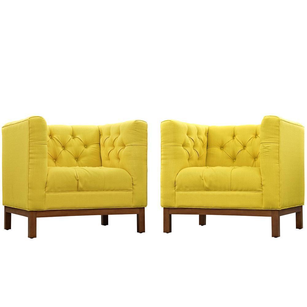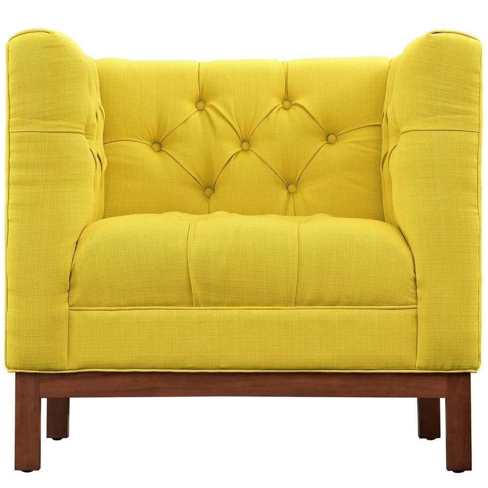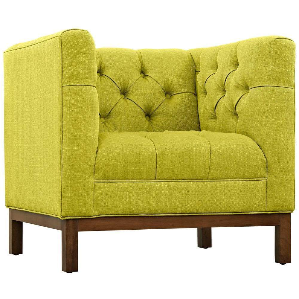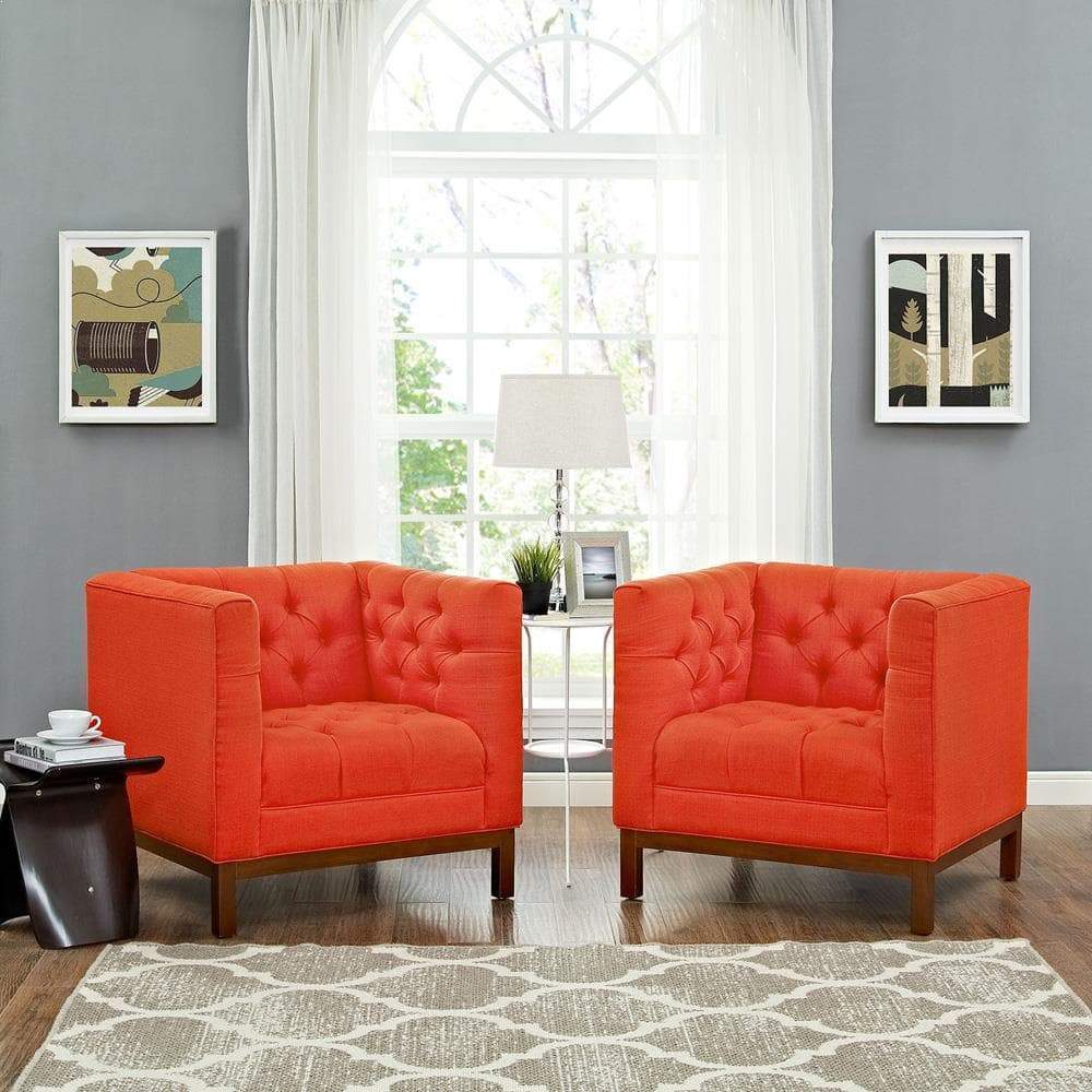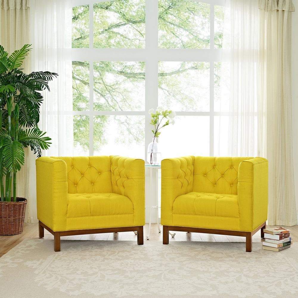 Add vivacity to your décor with the Panache Collection. Designed to express elegance and comfort, Panache comes outfitted with deeply tufted buttons and plush cushions for a timeless charm. Constructed with solid wood legs, fine fabric upholstering, and a reinvented mid-century style design with a dash of vintage charm, enhance your living room, lounge or meeting area with the Panache Collection. Set Includes: Two - Panache Fabric Armchair