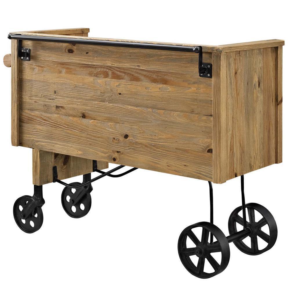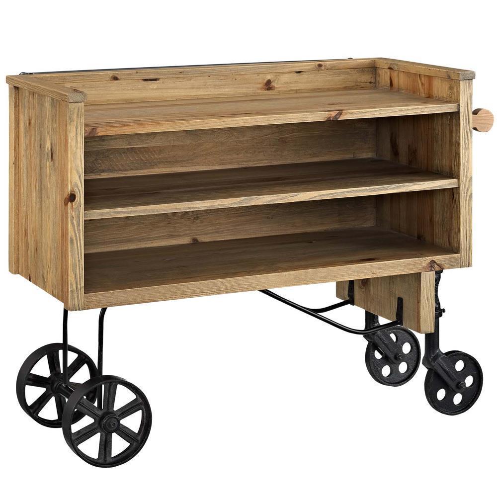Embrace nostalgia with the Prevail Wood Stand. Reminiscent of an old-time pushcart, showcase your wares with a clear lacquered pine wood serving stand supported by two sets of black lacquered steel wheels. Symbolic of simpler times, Prevail features an authentic rustic design perfect for use as a serving or display stand for the kitchen or dining room. Smaller front wheels fully rotate while the back bigger wheels move straight front and back.Set Includes:One - Prevail Dining Stand