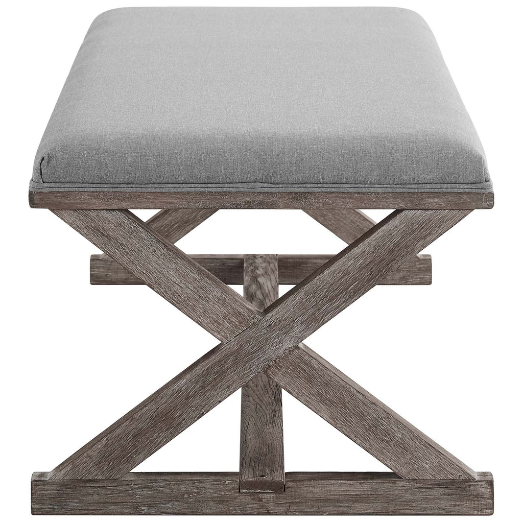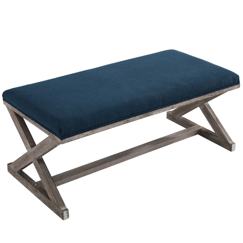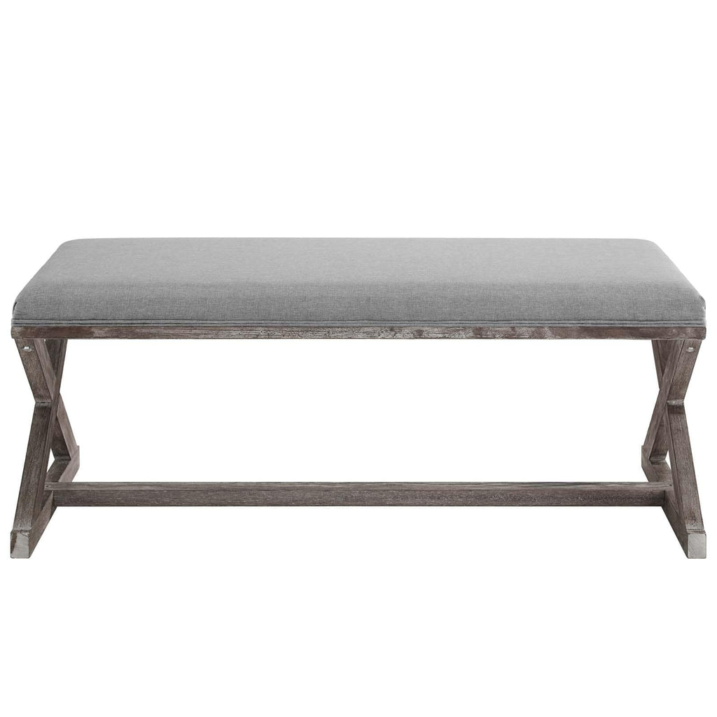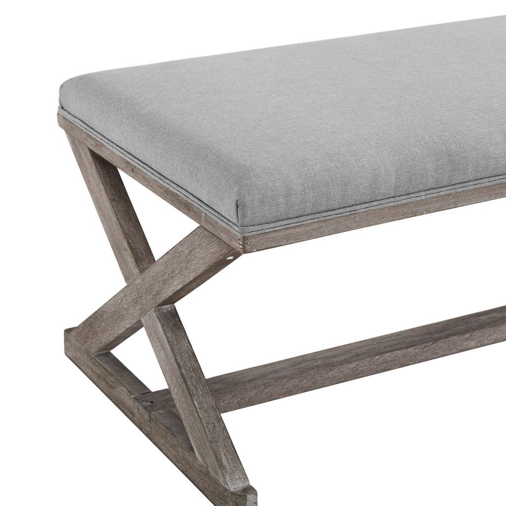 Introduce the simple elegance and rustic charm of vintage French-inspired style with the Province Bench. Adding functional seating to your entryway foyer, bedroom, or living room, this modern farmhouse accent bench features subtle piped trim, clean lines, and a weathered wood frame with X-brace details and horizontal stretcher. Finely upholstered in beautiful polyester fabric with dense foam padding, this upholstered bench is a perfect addition to modern farmhouse, contemporary, and vintage themed decors. Includes plastic foot caps to protect flooring. Bench Weight Capacity: 450 lbs. Set Includes: One - Province Vintage French X-Brace Bench