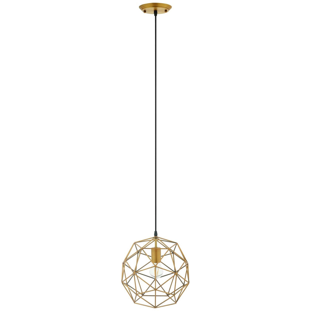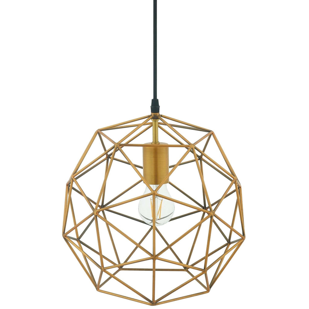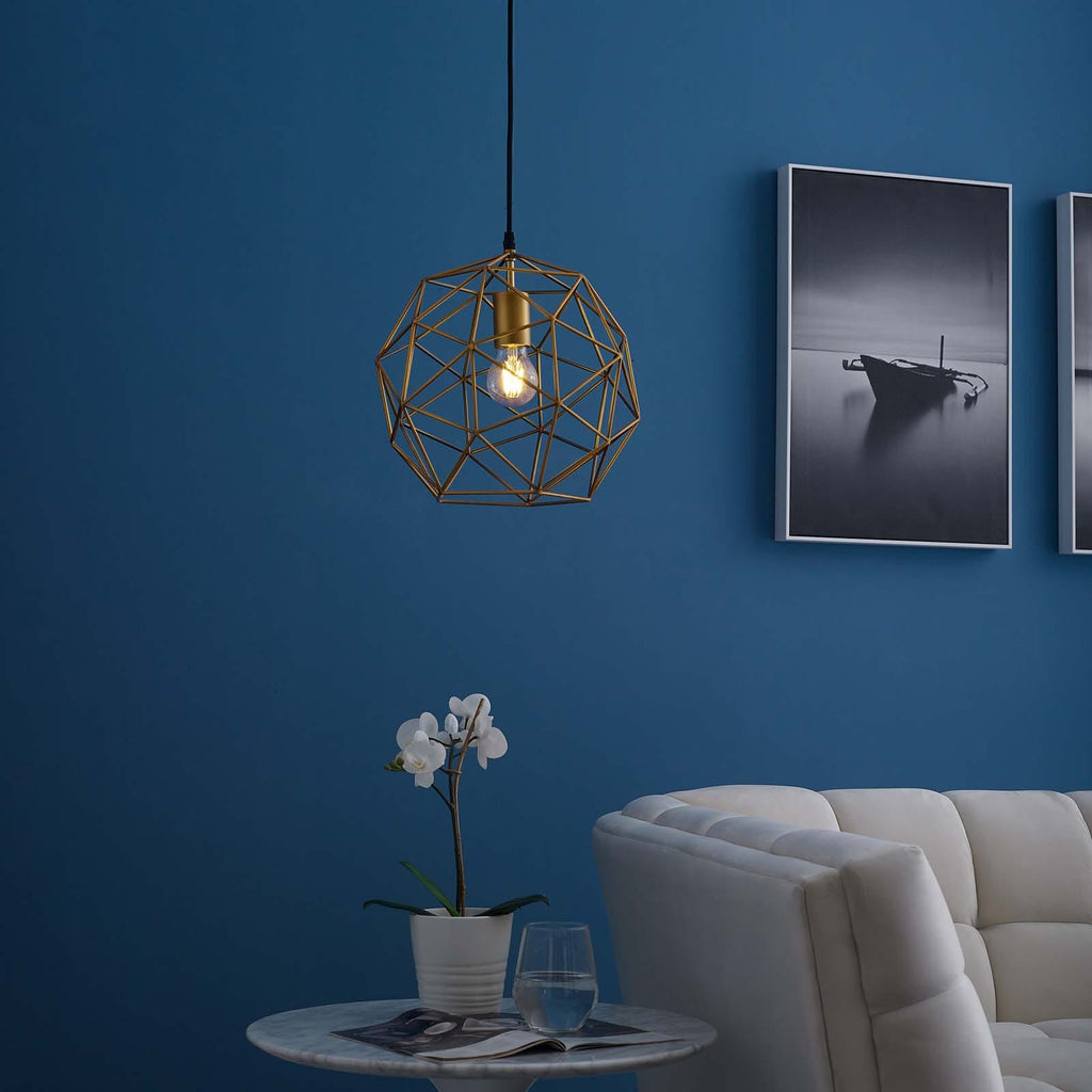 Bring contemporary style to your living space with the modern geometric design of the Rarity Geometric Decagon-Shaped Pendant Light. Attracting attention in the entryway, kitchen, living room, or dining room, this contemporary ceiling light fixture displays an open decagon-shaped cage shade made of antique brass metal and comes suspended from a slightly adjustable 65" two-core braided cable. Complete with a flush wall mount, Rarity requires one E26 60W bulb (not included). Set Includes: One - Rarity Geometric Decagon-Shaped Brass Pendant Light