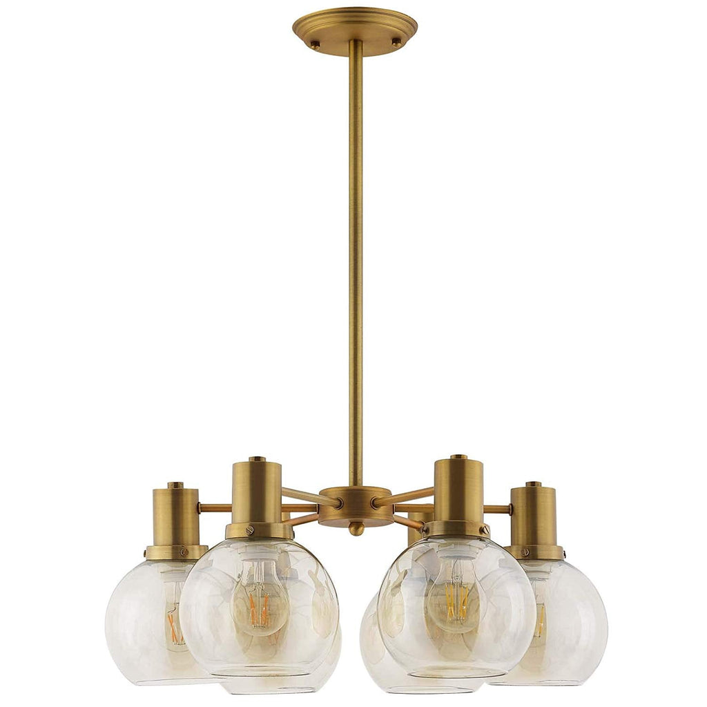Illuminate your surroundings with Resound. A striking piece with stylish a structural artform for the entryway, dining room, kitchen, or bedroom, the Resound Pendant Chandelier blends a chic luxe look with mid-century style. Casting a warm golden glow, amber glass globe shades cover six light bulbs and hang suspended from a brass metal ceiling fixture with a flush wall mount. Resound is an impressive chandelier for any contemporary space. This ceiling pendant requires six E26 40W bulbs (not included). Set Includes: One - Resound Amber Glass And Brass Pendant Chandelier