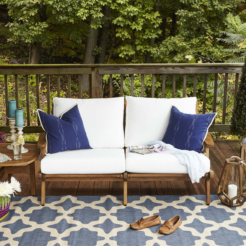 Refresh your space with the Saratoga Outdoor Patio Collection. Expertly crafted with Premium Grade A Teak Wood, Saratoga Outdoor Patio Loveseat features a striking slanted back design for the ultimate in both ergonomic comfort and contemporary design. A quality modern outdoor patio furniture series, Saratoga Outdoor Loveseat comes with machine washable sun, stain, water, and fade resistant Sunproof® Fabric with fine trim, mesh back, and wood slatted seat for durable, long-lasting support. The ideal setting for lounging or entertaining, the Saratoga Outdoor Patio Furniture Collection features combinations perfect for balconies, backyards, patios, gazebos, poolside or garden spaces. Includes non-marking plastic foot caps. Maximum Weight Capacity: 800 lbs. Set Includes: One - Saratoga Loveseat