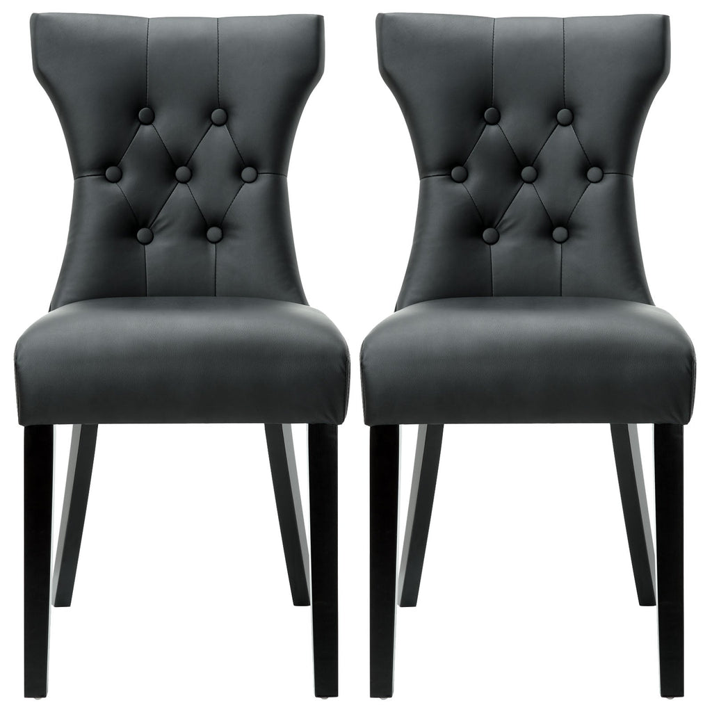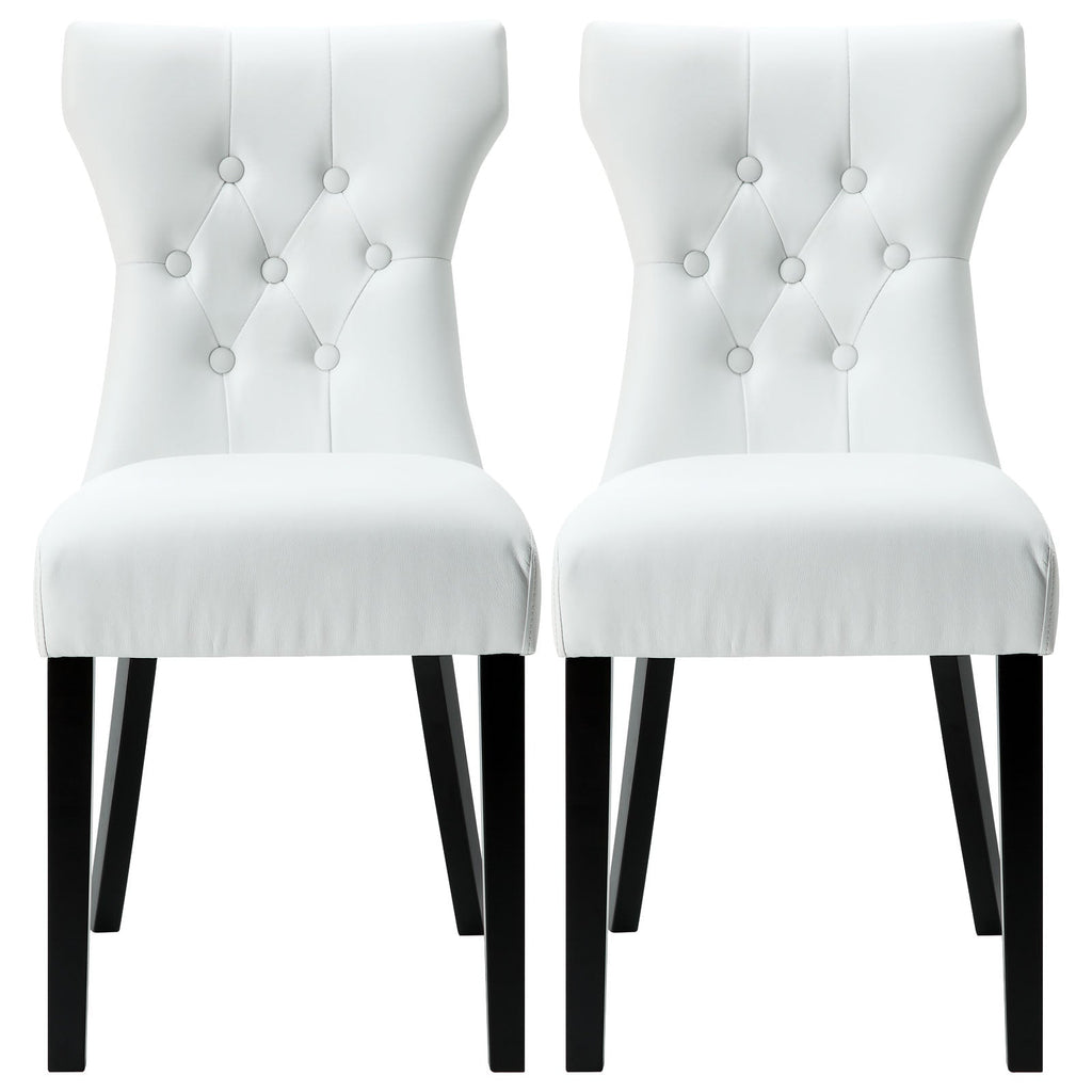 Graceful curves whisper elegance from every position. A softly tapered back and rounded hardwood legs lend distinguished support to this hourglass-shaped chair. Invite your way into the lap of luxury at every gathering. Set Includes: Two - Silhouette Modern Dining Chairs