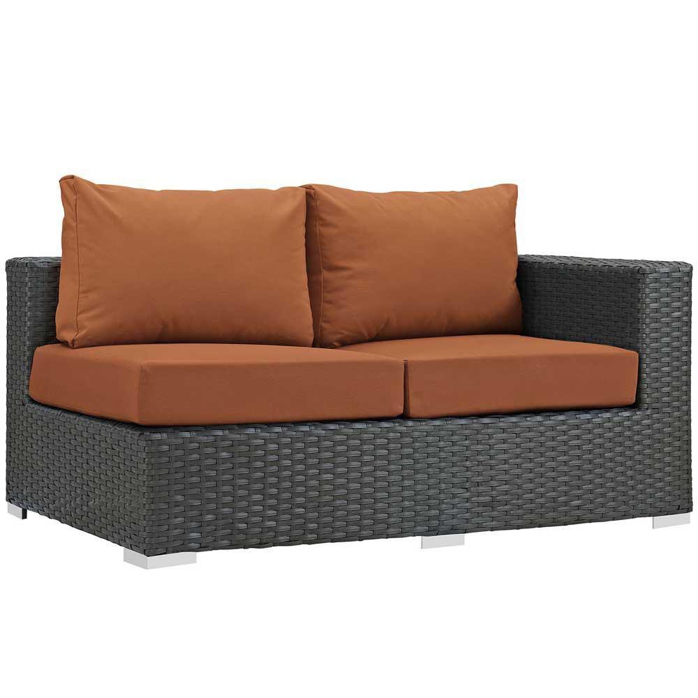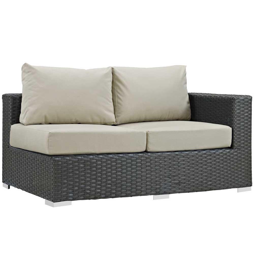 Outfit your patio with an imaginative outdoor sectional series of exceptional quality. The Sojourn series offers a robust seating experience that easily rearranges according to usage. Outfitted with industry-leading Sunbrella fabric cushions, synthetic rattan weave, UV protection, powder-coated aluminum frame, immensely enjoy your outdoor time with a series that enhances patio, backyard or poolside areas. This installment of the series is an Outdoor Patio Right Arm Loveseat. Set Includes: One - Sojourn Right Arm Loveseat