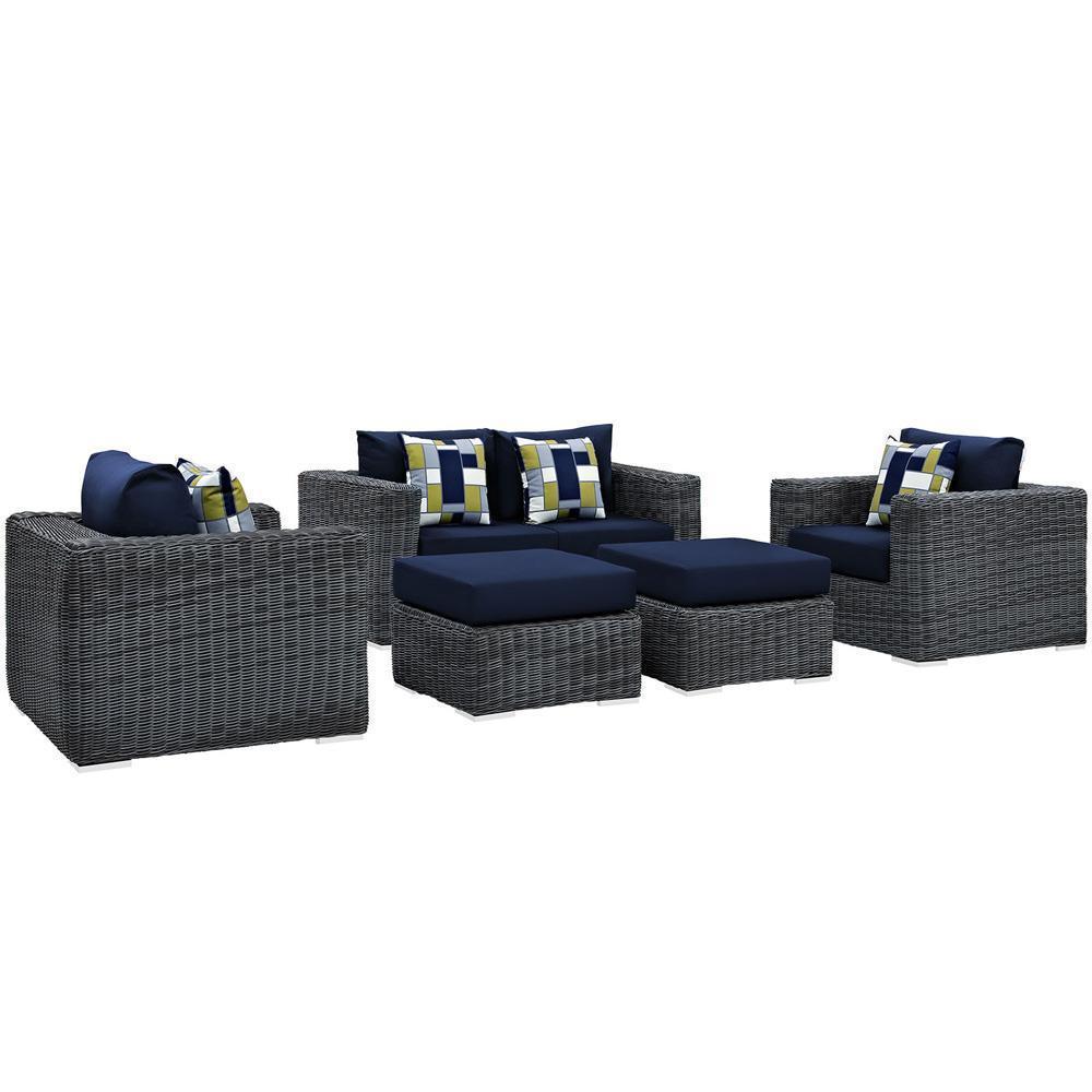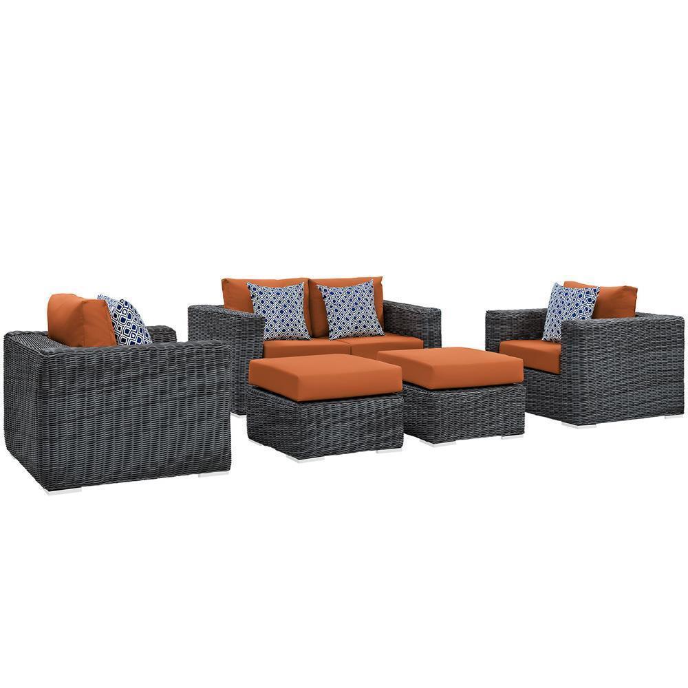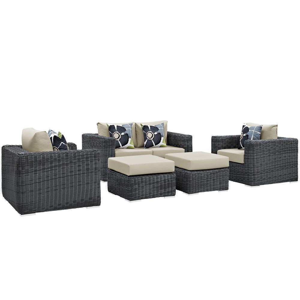 Experience the outdoors with exceptional comfort and quality. Summon Outdoor Patio Sectional Sofa set offers an exquisite two-tone synthetic rattan weave, plush all-weather cushions with industry-leading Sunbrella® fabric, UV protection, and a sturdy powder-coated aluminum frame. Featuring an elegant modern look, Summon Patio Sectional Sofa Set is part of an avant-garde outdoor sectional series well-equipped for enhancing patio, backyard, or poolside gatherings. This installment of the series is an Outdoor Patio Furniture set. Set Includes: One - Summon Rattan Outdoor Patio Loveseat Two - Summon Rattan Outdoor Patio Armchairs Two - Summon Rattan Outdoor Patio Ottomans