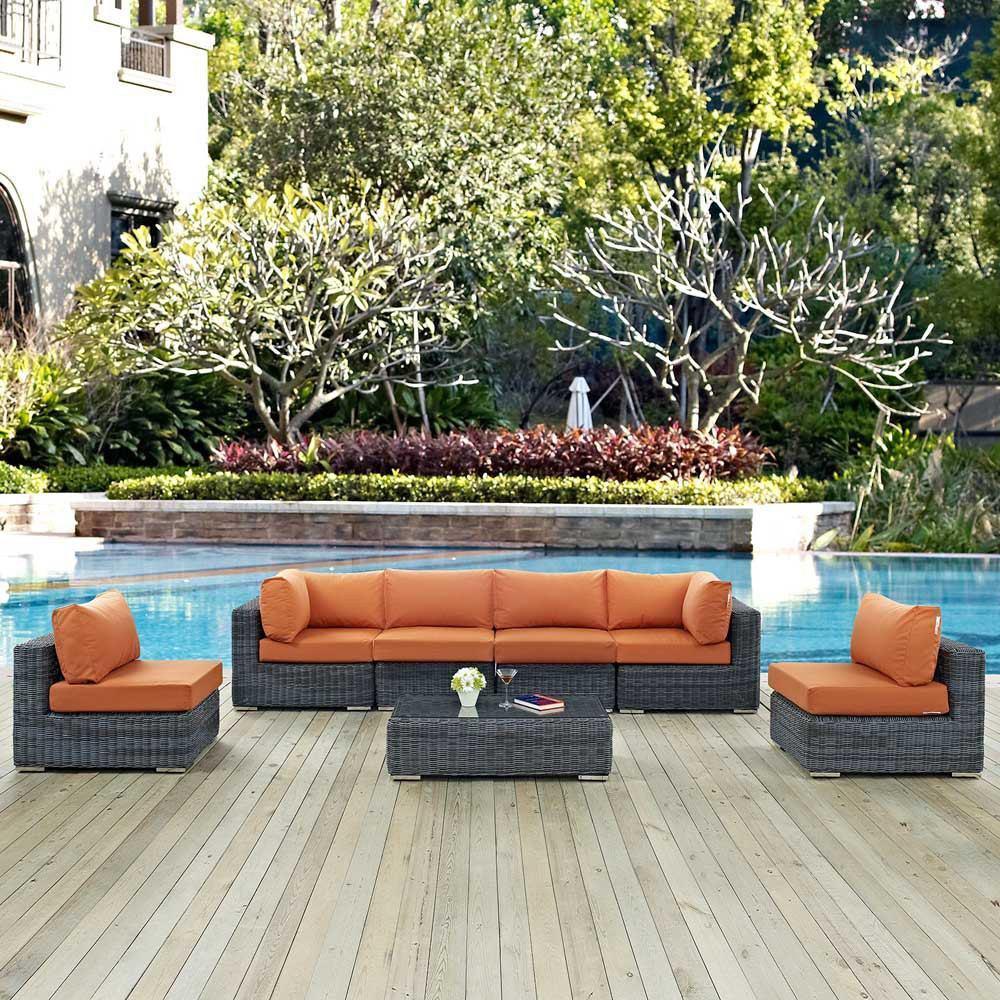 Experience the outdoors with exceptional comfort and quality. Summon Outdoor Patio Sectional Sofa set offers an exquisite two-tone synthetic rattan weave, plush all-weather cushions with industry-leading Sunbrella® fabric, UV protection, and a sturdy powder-coated aluminum frame. Featuring an elegant modern look, Summon Patio Sectional Sofa Set is part of an avant-garde outdoor sectional series well-equipped for enhancing patio, backyard, or poolside gatherings. This installment of the series is an Outdoor Patio Furniture set with Coffee Table. Set Includes: Four - Summon Rattan Outdoor Patio Armless Chairs One - Summon Rattan Outdoor Patio Coffee Table Two - Summon Rattan Outdoor Patio Corners