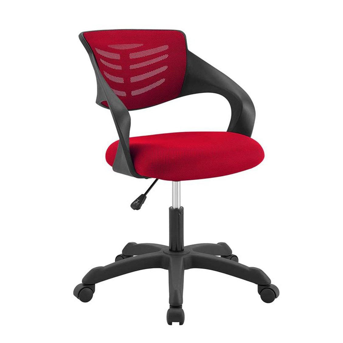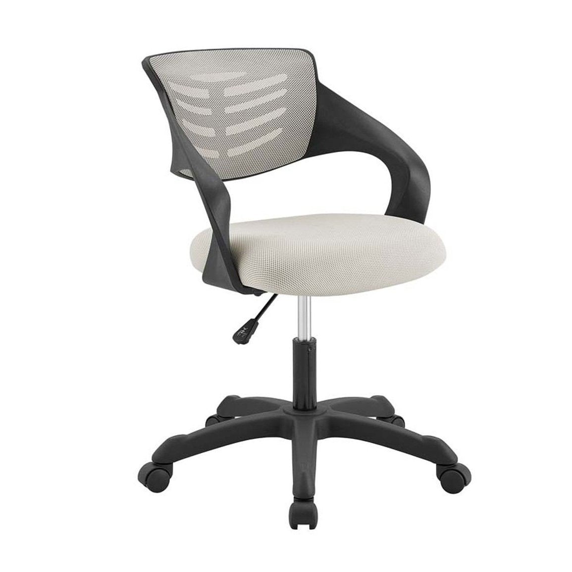 Energize your office decor with Thrive. This sturdy nylon frame drafting chair comes with a breathable mesh back which combines passive lumbar support and cooling comfort. Spiraling armrests imbue a creative vibe, while the densely padded mesh seat delivers reliable comfort. Complete with one-touch height adjustment, full 360-degree swivel, and five dual-wheel casters for natural movement of either carpeted or hardwood surfaces, Thrive is an office chair that stands to be at the forefront of your work endeavors. Set Includes: One - Thrive Mesh Office Chair