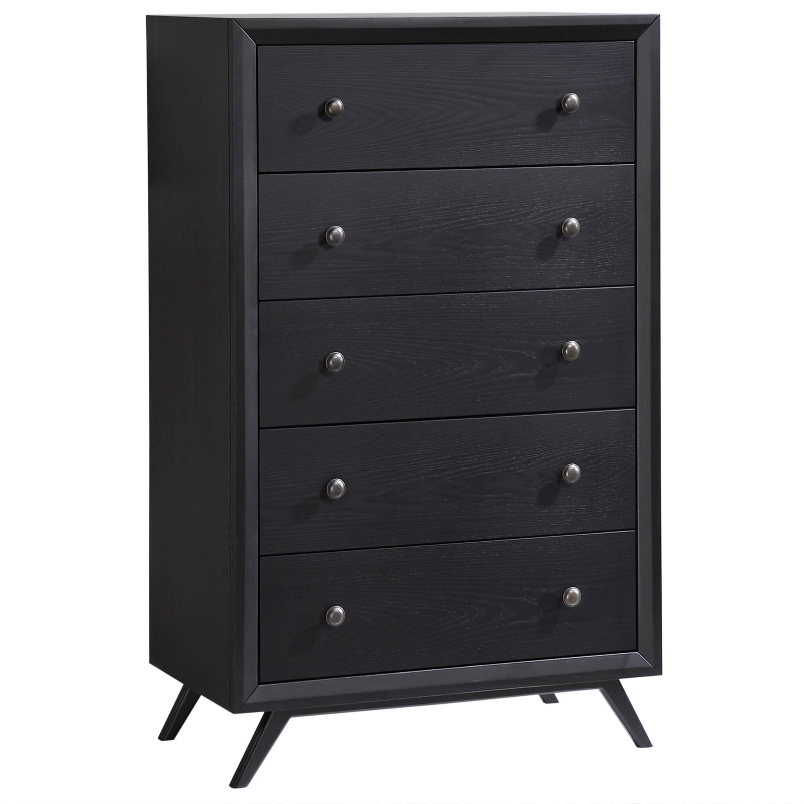 A vintage look and rich mid-century design adorn the Tracy bedroom chest. This finely crafted toffee brown stained piece comes with six easy-glide storage drawers, antique finish metal handles, and outstretched platform legs. Built upon solid edging and craftsmanship techniques, the Tracy chest requires assembly and wipes clean with a dry cloth. Set Includes: One - Tracy Chest
