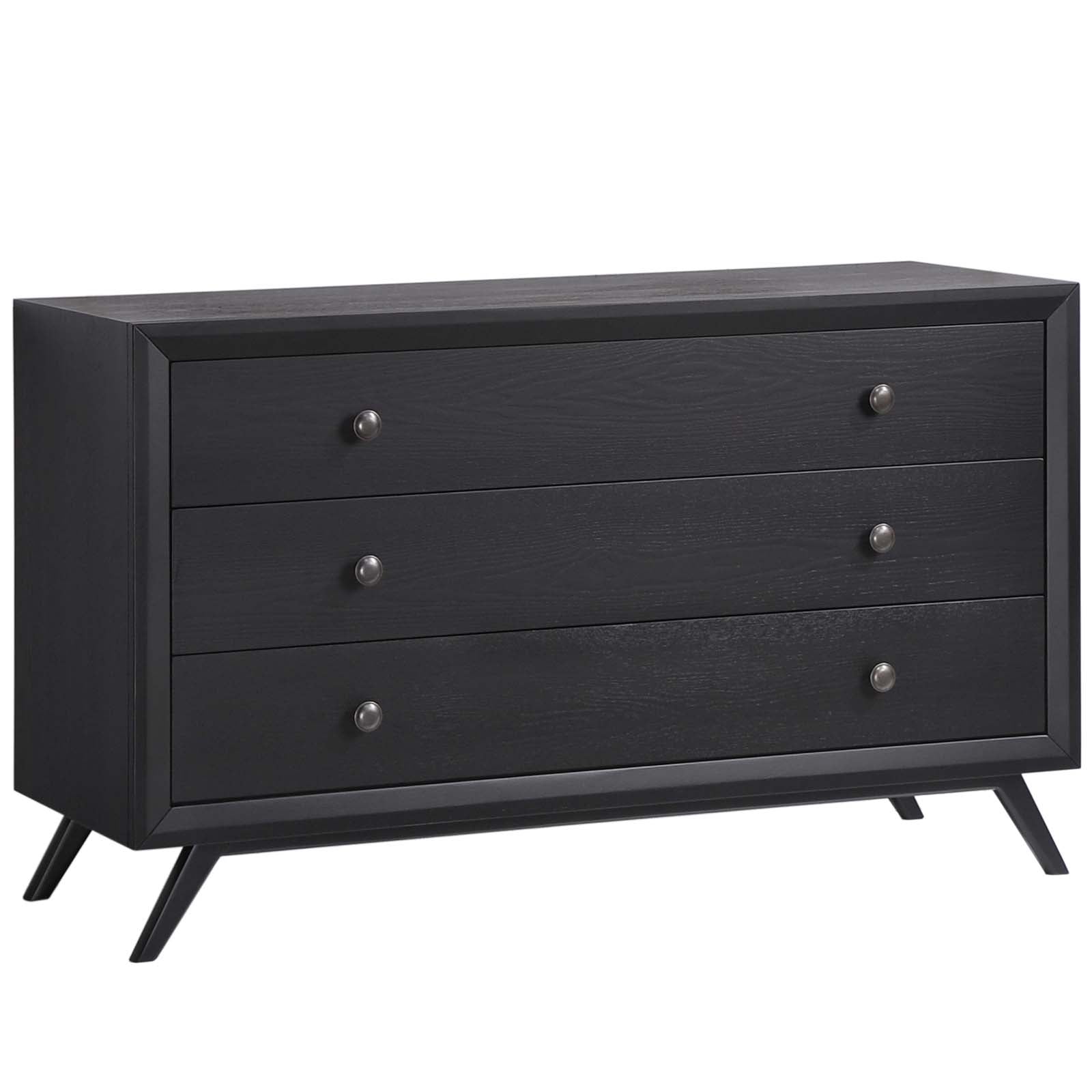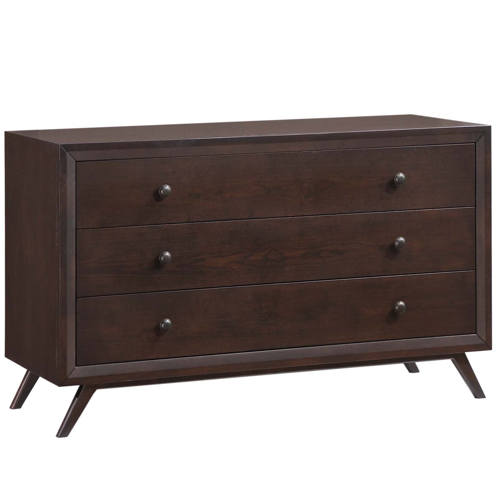 A vintage look and rich mid-century design adorn the Tracy bedroom dresser. This finely crafted toffee brown stained piece comes with three easy-glide storage drawers, antique finish metal handles, and outstretched platform legs. Built upon solid edging and craftsmanship techniques, the Tracy dresser requires assembly and wipes clean with a dry cloth. Set Includes: One - Tracy Dresser