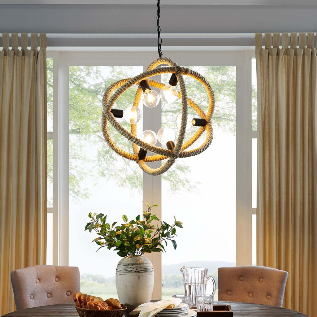 Instill modern farmhouse charm with the Transpose Pendant Chandelier. Enhancing dining room, living room or hallway decors, Transpose features an elongated orb structure carefully wrapped in durable rope with six black iron metal light sockets and a height adjustable chain. Requires Six E26 40W Bulbs (Not Included). Set Includes: One - Transpose Pendant Chandelier