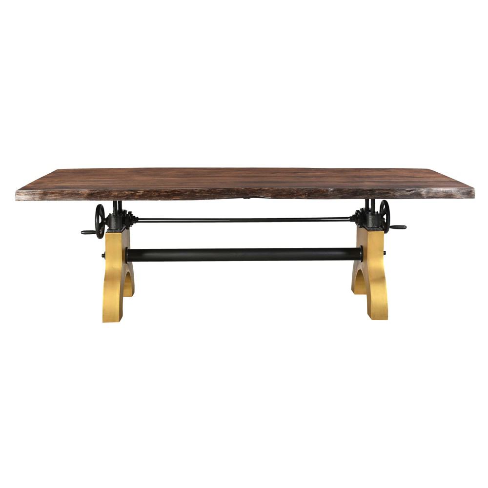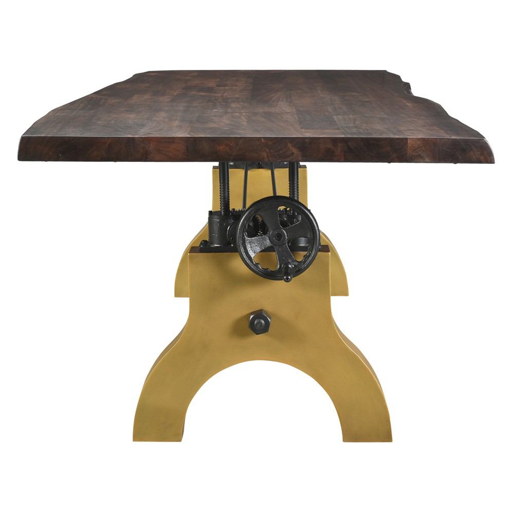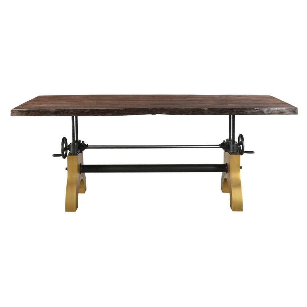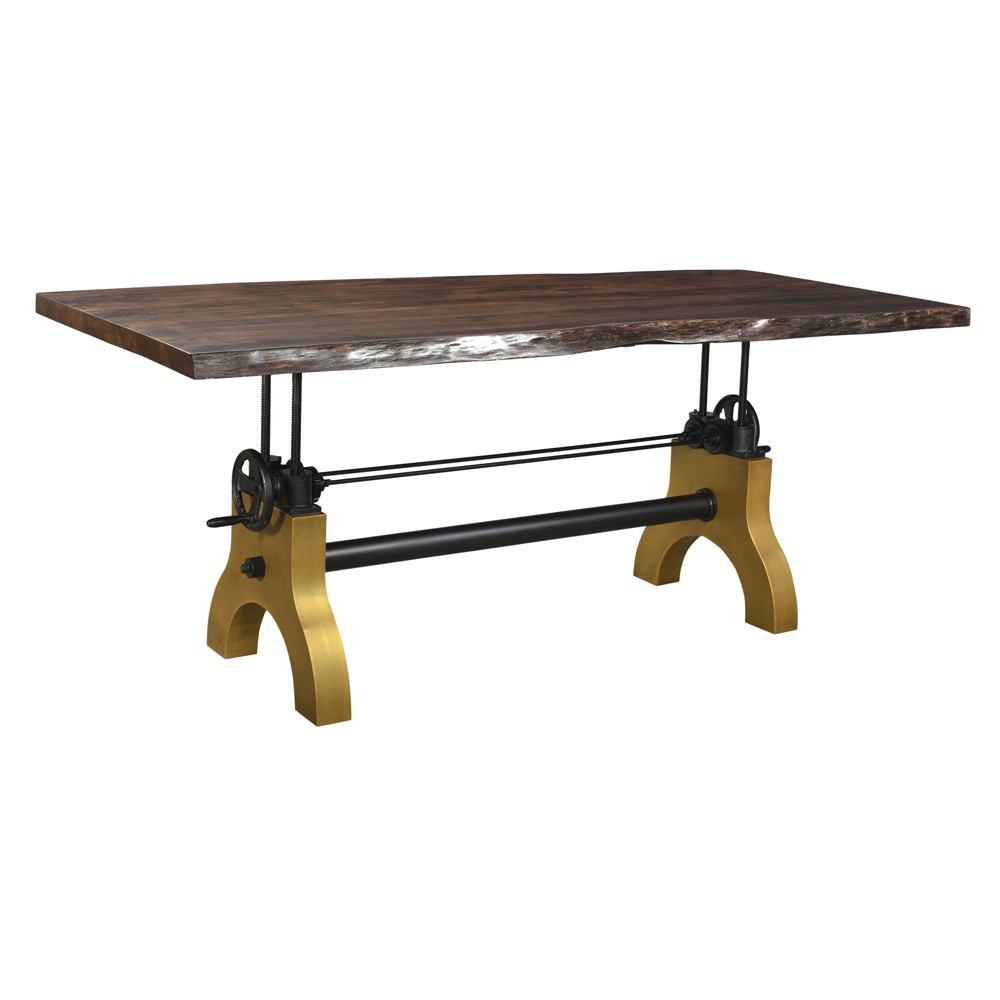 A bar style table or a traditional dining table. The choice is yours with the Dunedin Dining Table. A solid acacia wood table top, and brass detailing make this table stand out from the rest as a versatile headliner with its rustic design. Use the attached cast-iron gear mechanism to raise and lower the table as desired. Adjustable height from dining to bar height. The hefty iron base will give an industrial flair to your d©cor. Please note that there are natural variations in the solid acacia wood table top™s grain and knot consistencies. Each table will be unique. Cast Iron gear mechanism for raising and lowering the table top Industrial Style. Made in India. We are offering 1 year limited warranty (covered for any manufacturer's defect). Construction: Solid Acacia Wood. Frame: Steel Base. Other materials: Cast Iron Gear Mechanism. We understand how important your home is and how decorating your kitchen, dining room or bedrooms with classy, contemporary furnishings can help make it a place that reflects who you are. We believe in the power modern furniture has in creating not just a home but YOUR home. We believe in feeling good about our home's environment, and we think you do too.