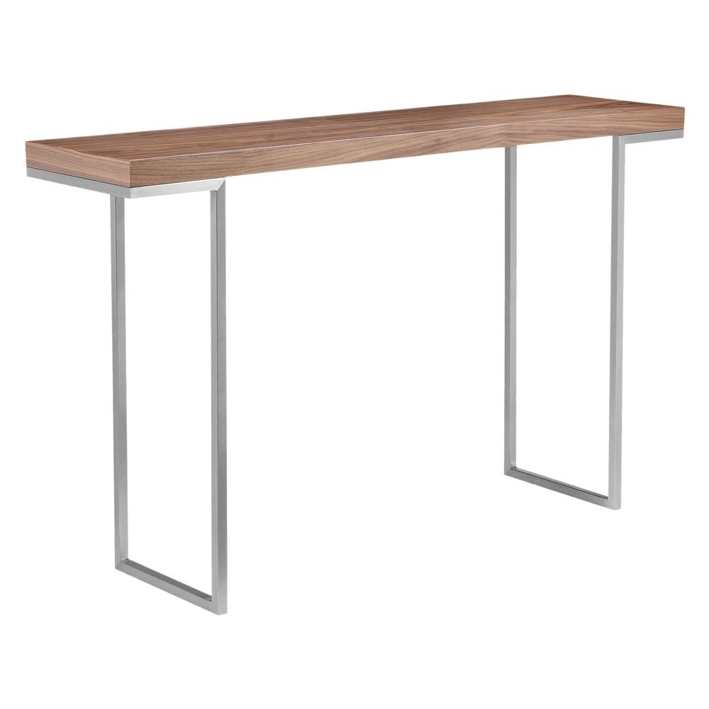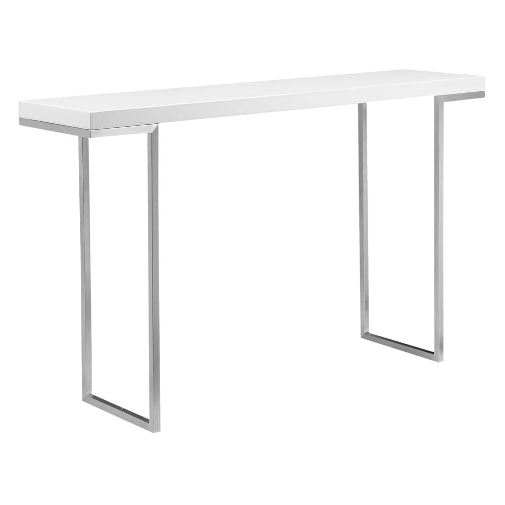 Contemporary simple design console table with inset legs. Compact size for fits perfect for smaller spaces. Bright white finish. Contemporary Modern Style. Part of Repetir collection. Made in China.