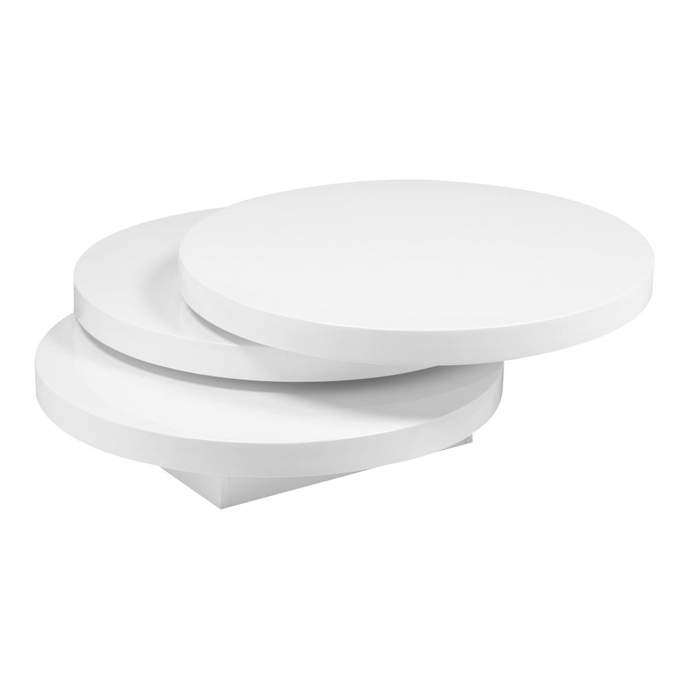 White lacquer round coffee table. The top 2 levels swivel 360 degrees. Contemporary Modern Style. Part of Torno collection. Made in China. We are offering 1 year limited warranty (covered for any manufacturer's defect). Construction: White veneer, MDF.